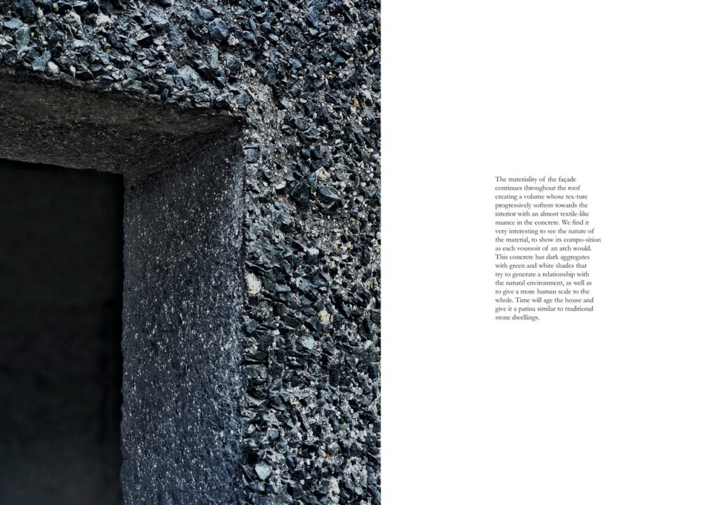 The materiality of the façade continues throughout the roof creating a volume whose texture progressively softens towards the interior with an almost textile-like nuance in the concrete. We find it very interesting to see the nature of the material, to show its composition as each voussoir of an arch would. This concrete has dark aggregates with green and white shades that try to generate a relationship with the natural environment, as well as to give a more human scale to the whole. Time will age the house and give it a patina similar to traditional stone dwellings.