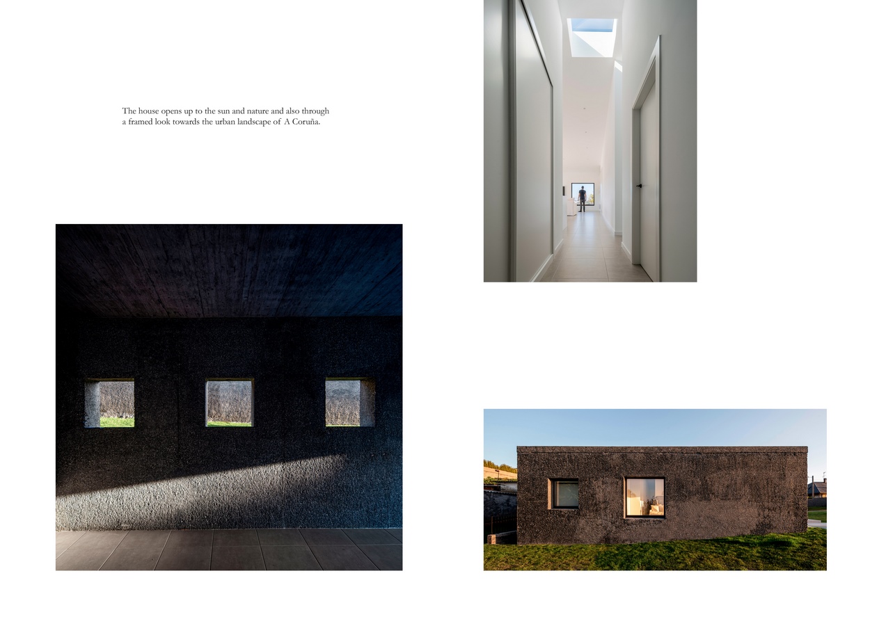 The house opens up to the sun and nature and also through a framed look towards the urban landscape of A Coruña. We created a filter of walls that generate from the day area a space prior to the exterior and facilitates a more intimate atmosphere for the inhabitant. The inner-outer boundary is resolved through this filter and by emptying the volume. The house is massive, timeless and contained. We seek a clear sense of protection with a rough material that faces the outside and contrasts with the warm interior.