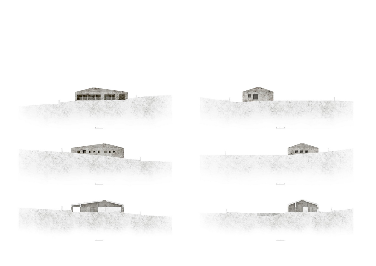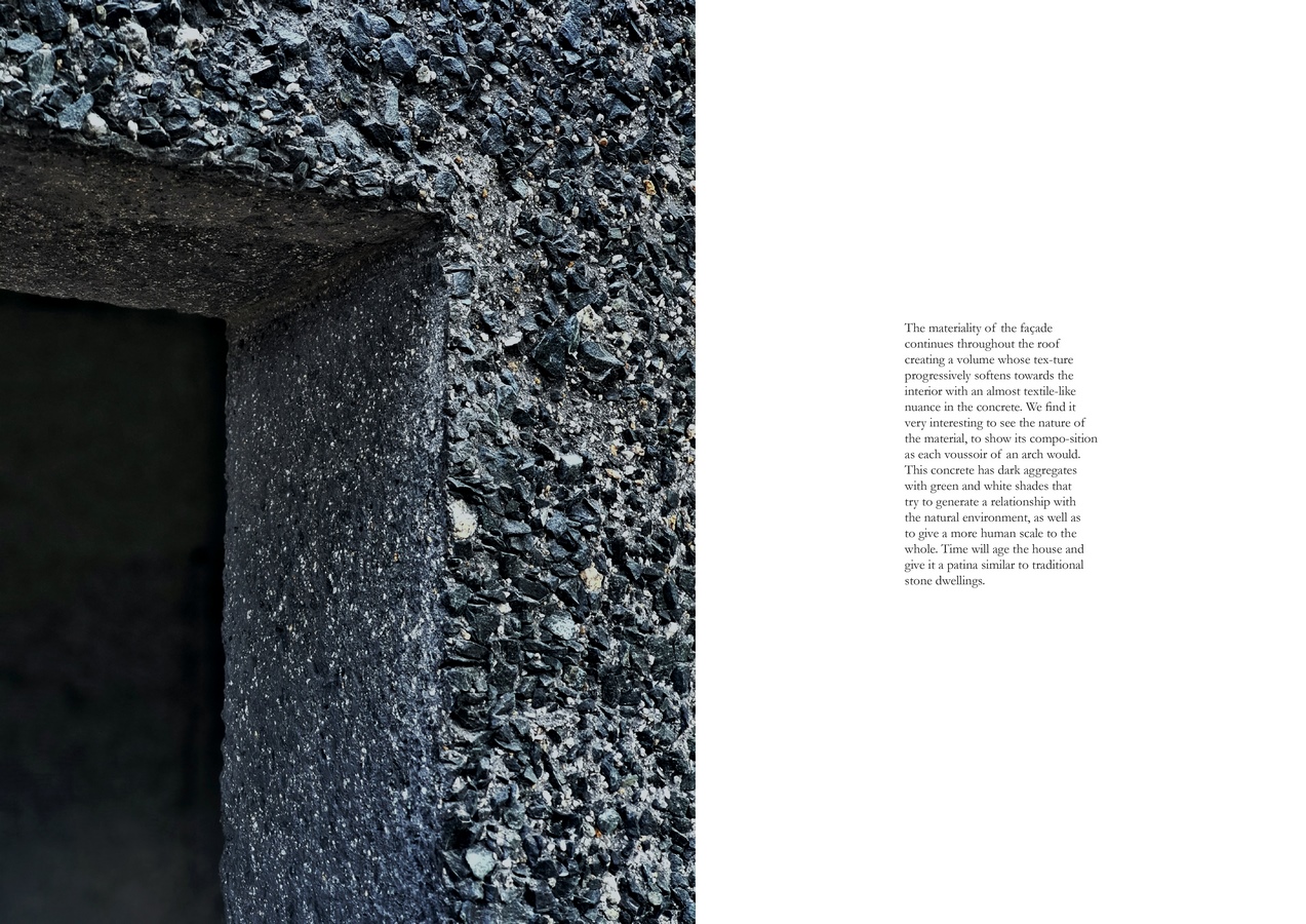 The materiality of the façade continues throughout the roof creating a volume whose texture progressively softens towards the interior with an almost textile-like nuance in the concrete. We find it very interesting to see the nature of the material, to show its composition as each voussoir of an arch would. This concrete has dark aggregates with green and white shades that try to generate a relationship with the natural environment, as well as to give a more human scale to the whole. Time will age the house and give it a patina similar to traditional stone dwellings.