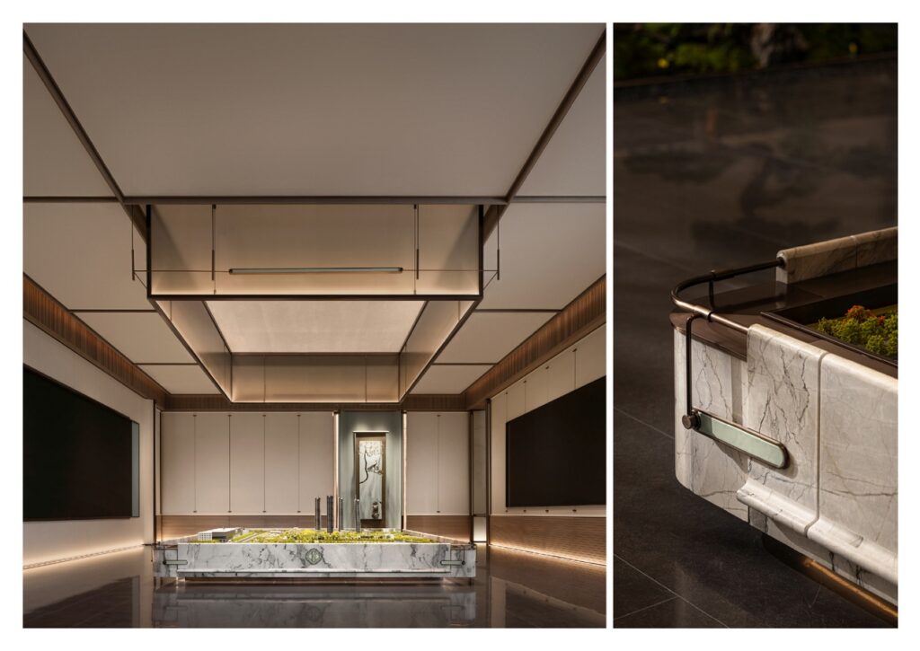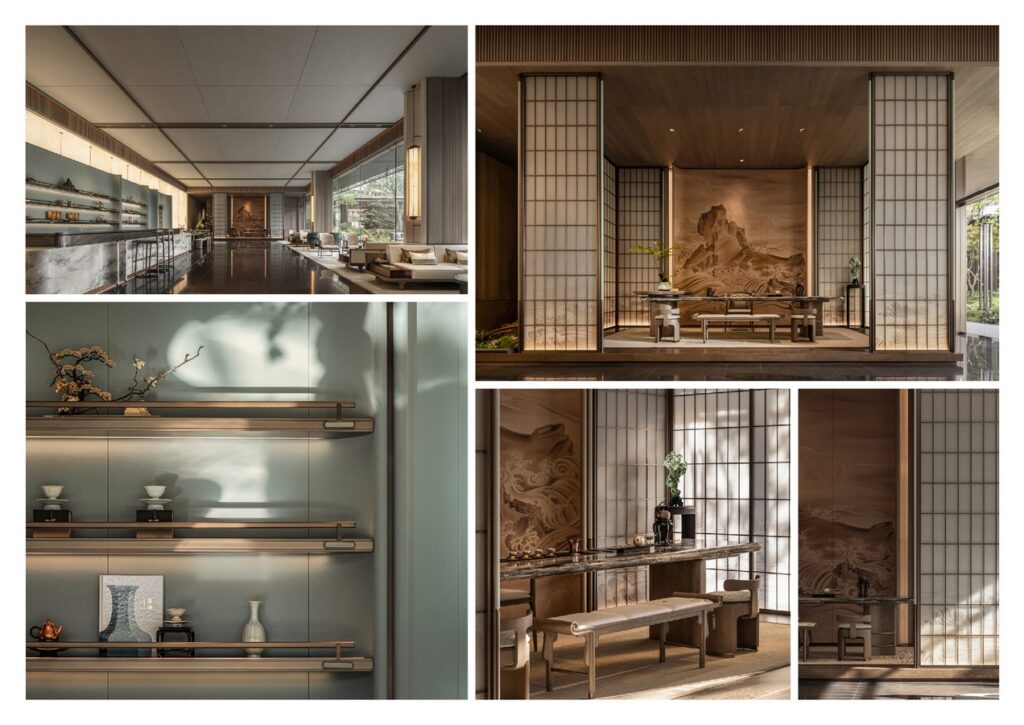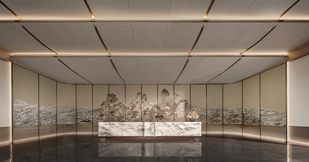 Inspired by the renowned Song Dynasty painting The Panorama of Rivers and Mountains, the lobby’s backdrop utilizes enamel-painted glass craftsmanship to reinterpret the artwork’s majestic landscapes. As natural light filters through the glass, shifting shadows trace mountain silhouettes like brushstrokes on parchment, imbuing the space with dynamic artistic vitality.