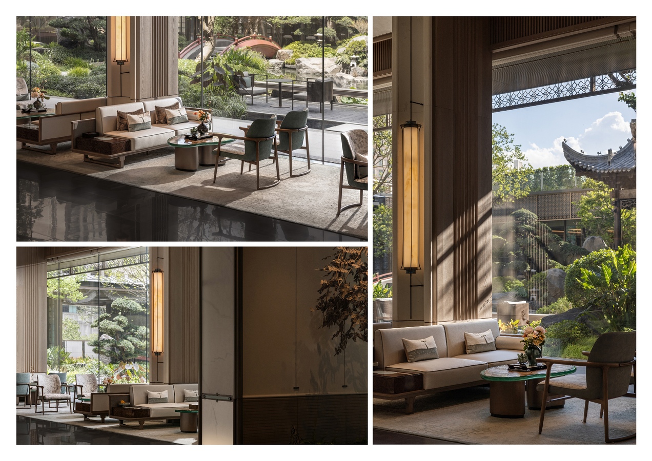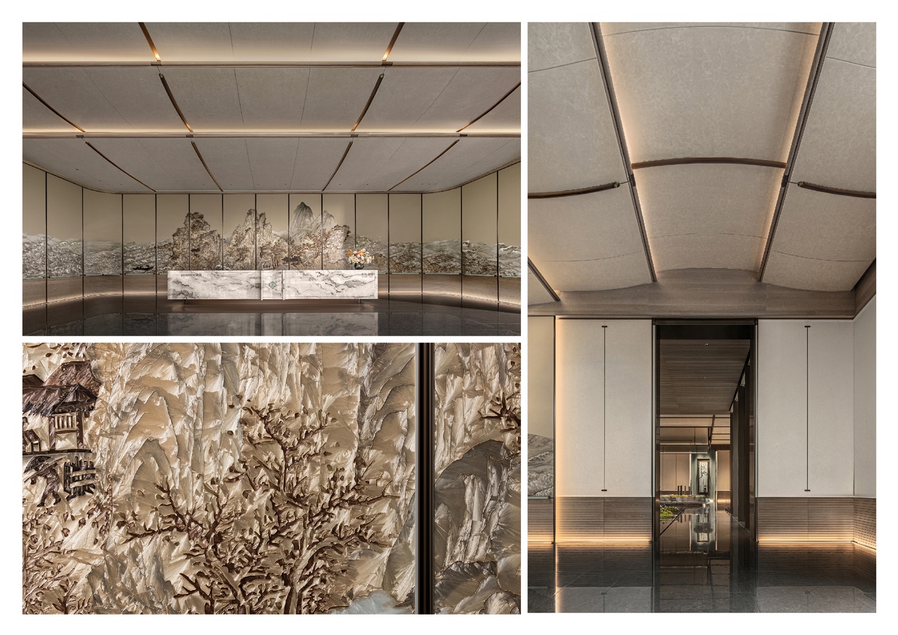Inspired by the renowned Song Dynasty painting The Panorama of Rivers and Mountains, the lobby’s backdrop utilizes enamel-painted glass craftsmanship to reinterpret the artwork’s majestic landscapes. As natural light filters through the glass, shifting shadows trace mountain silhouettes like brushstrokes on parchment, imbuing the space with dynamic artistic vitality.