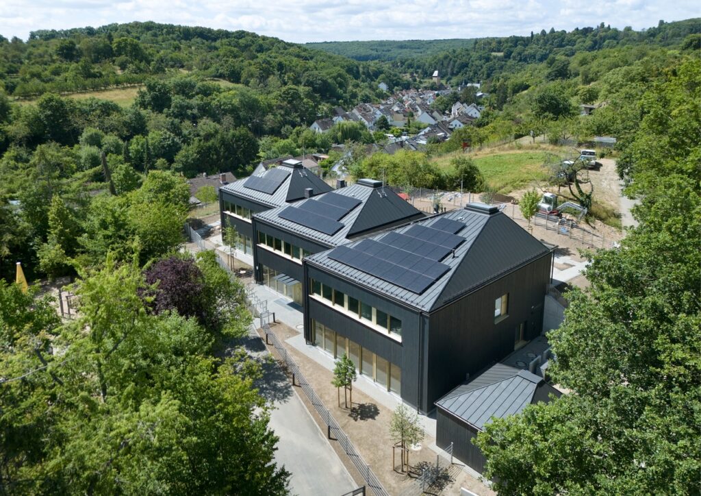 The two-storey building with a dark grey wooden façade is divided into three equally wide structures, each with a truncated pyramid roof fitted with photovoltaics. The concept is characterized by the topography of the site with its significant height difference: the ground floor is pushed into the slope and carefully integrates the building into its surroundings.