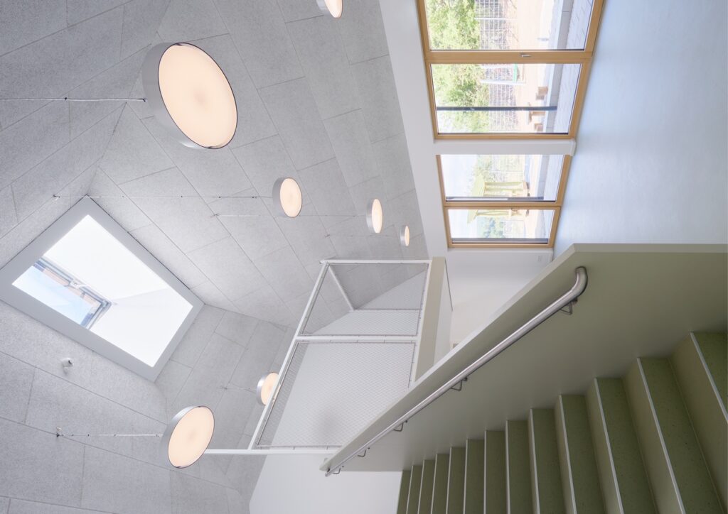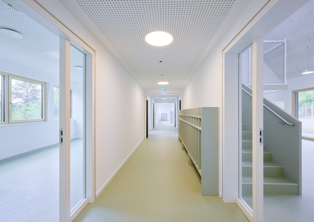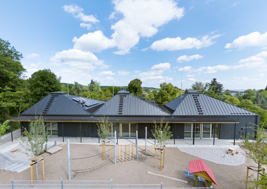 The daycare centre meets the KFW Efficiency House 40 standard. Heat pumps in combination with underfloor heating provide the heat supply. The photovoltaic system on the roofs produces electricity for the centre’s own needs, with any surplus being fed into the grid. Rainwater is collected in cisterns and used to irrigate the green areas. The result is a child-friendly building that combines functionality, sustainability and architectural quality to create a future-proof place for education and care.