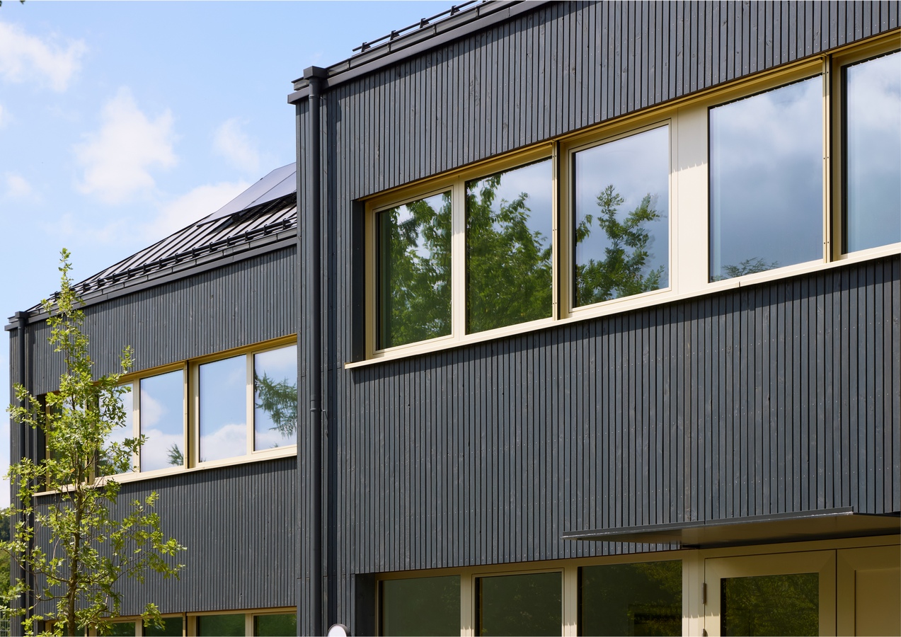 The two-storey building with a dark grey wooden façade is divided into three equally wide structures, each with a truncated pyramid roof fitted with photovoltaics. The concept is characterized by the topography of the site with its significant height difference: the ground floor is pushed into the slope and carefully integrates the building into its surroundings.