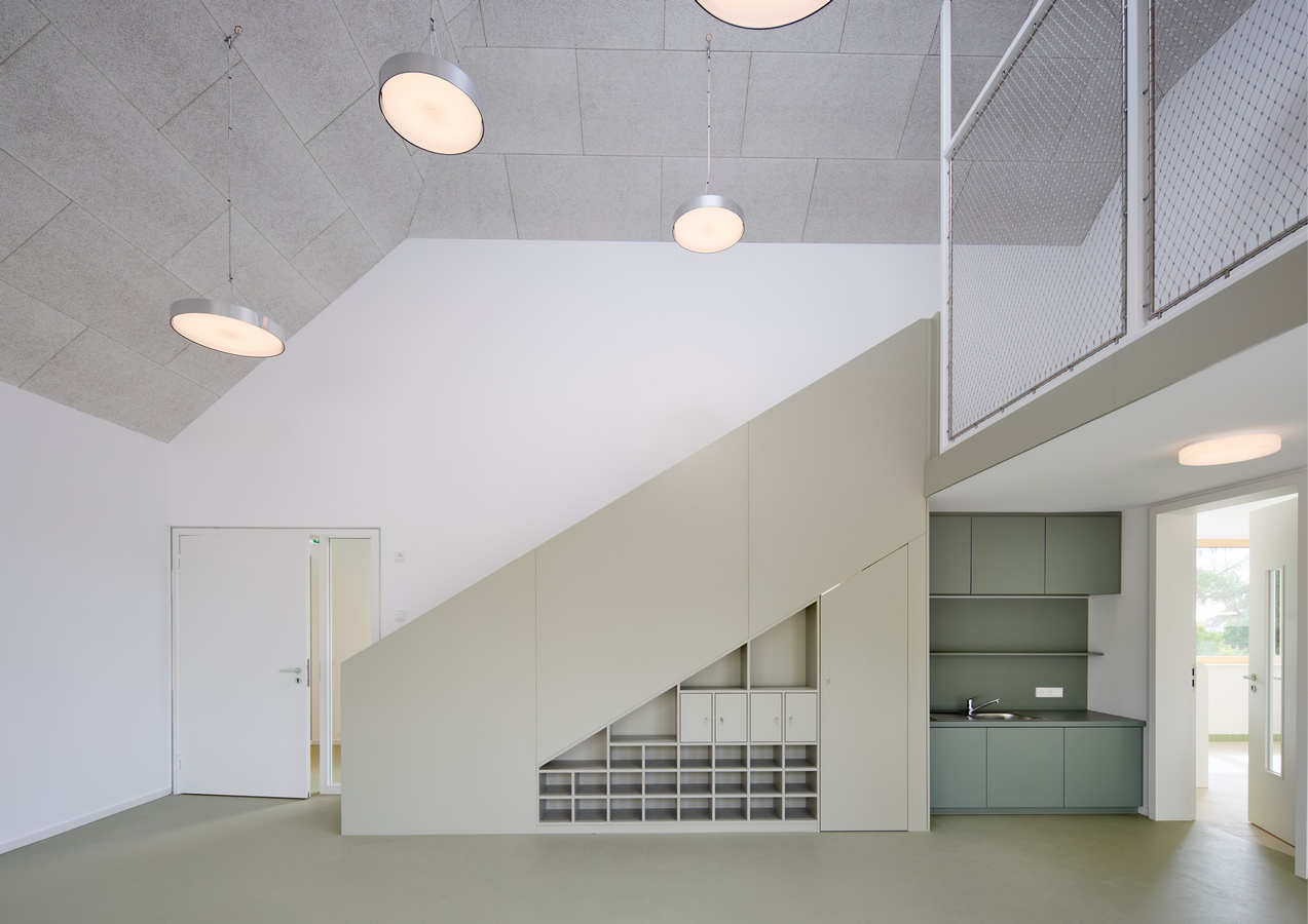 Light-coloured ribbon windows divide the dark façade towards the access road in the east. The central entrance with canopy and car and bicycle parking spaces is kept in the same light colour as the window frames and is clearly legible. The adjoining foyer forms the arrival area; the crèche group, a multipurpose room for events and exercise, the management office and the kitchen are accessed from here. An open staircase leads to the upper floor with three group rooms under the high pyramid roofs. A central skylight in each group room brings daylight deep into the building. Spacious, light-filled rooms and suspended play levels become adventure spaces with various opportunities for movement and retreat. Simple, colour-coordinated built-in furniture structures the interior and creates a sense of calm.