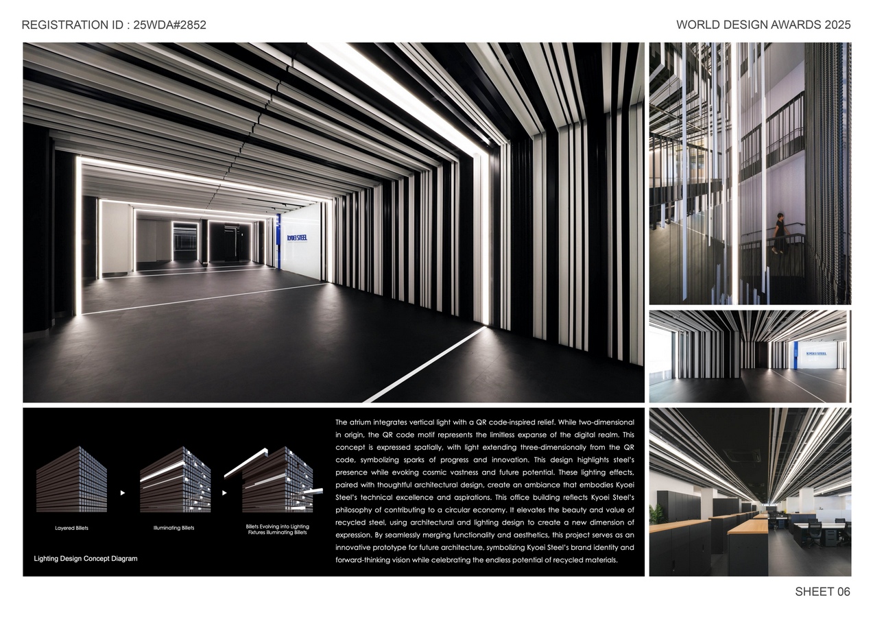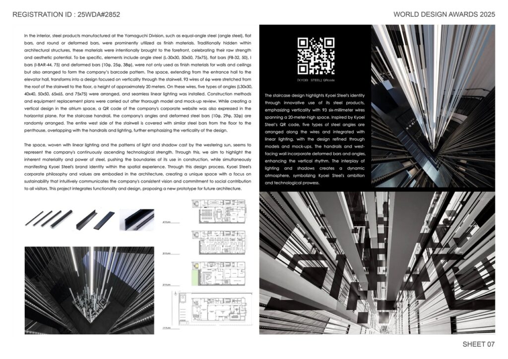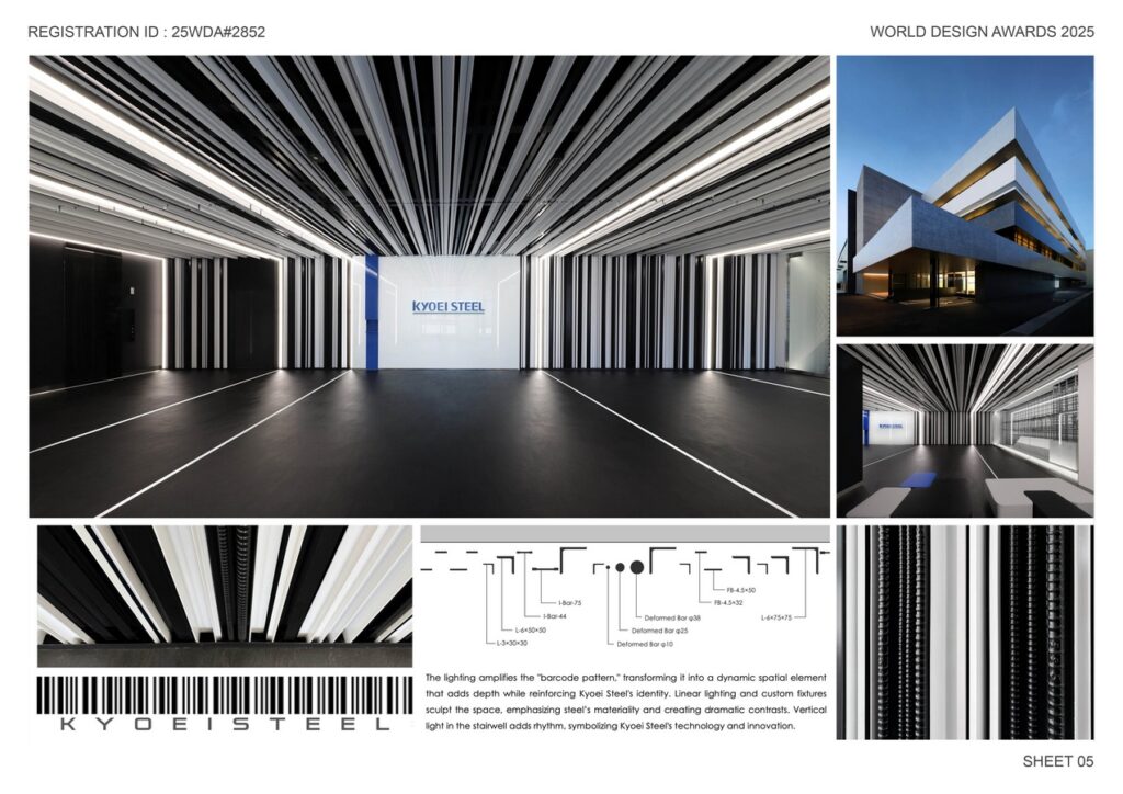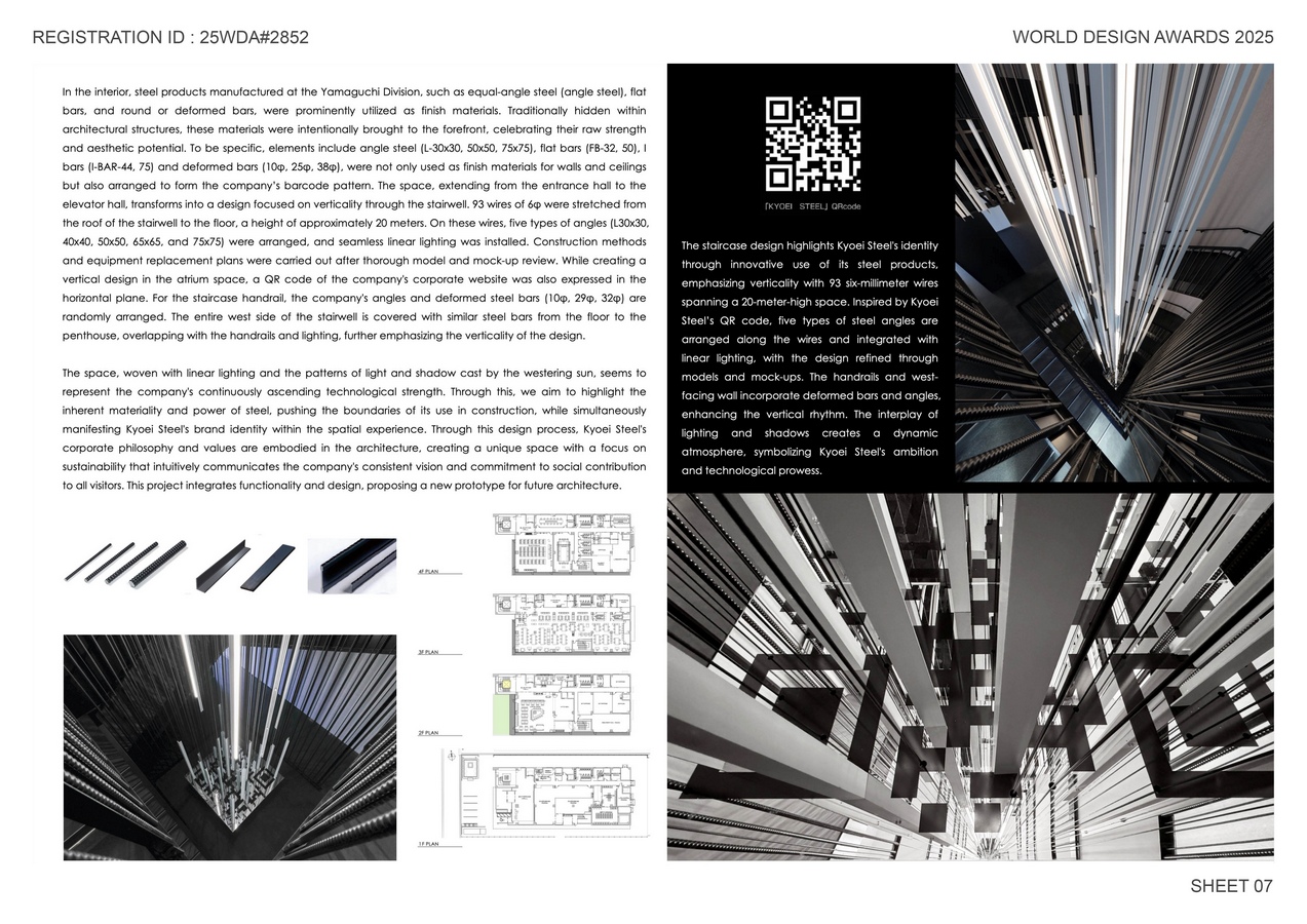 This project, at Kyoei Steel’s Yamaguchi Division, replaces and consolidates aging office and welfare buildings, enhancing site efficiency. By centralizing dispersed office functions, the new building improves productivity and provides a better working environment, while enriching welfare facilities, including dining halls and bathhouses. The exterior design, inspired by steel billets stored at the plant, symbolizes regenerating scrap iron into structural steel. The facade features five stacked billets with varied attributes, enhanced by two vertically divided stairwell volumes, forming a composition of seven billets. Each billet’s unique colors and textures reflect Kyoei Steel’s product diversity and identity in a striking aesthetic. Inside, steel products from the Yamaguchi Division, such as equal-angle steel, flat bars, and deformed bars, are prominently featured as finish materials, celebrating their raw strength and aesthetic potential. Materials like angle steel (L30x30, 50×50, 75×75), flat bars (FB-32, 50), I-bars (I-BAR-44, 75), and deformed bars (10φ, 25φ, 38φ) were used for walls, ceilings, and the company’s barcode pattern. This barcode, serving as a symbol of traceability, embodies the company’s commitment to transparency and accountability in its recycling process, visually connecting material flows with corporate identity. The stairwell features 93 wires (6φ) stretched across 20 meters, with five types of angles and seamless lighting. A QR code of the company’s website is integrated into the horizontal plane, while staircase handrails use randomly arranged angles and deformed steel bars. On the west side, similar steel bars cover the stairwell from floor to penthouse, interacting with handrails and lighting to emphasize verticality. This interplay of light, shadow, and raw steel highlights Kyoei Steel’s technological strength and innovative spirit. Dynamic lighting effects embody the company’s brand identity. By showcasing materials and integrating values, the project harmonizes functionality and design. Rooted in the company’s recycling philosophy, it presents a prototype for architecture merging sustainability, innovation, and identity with a unique spatial experience.