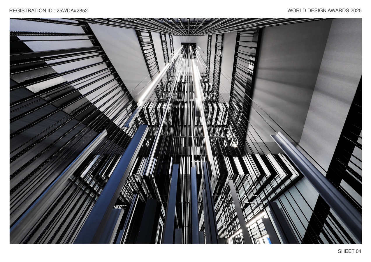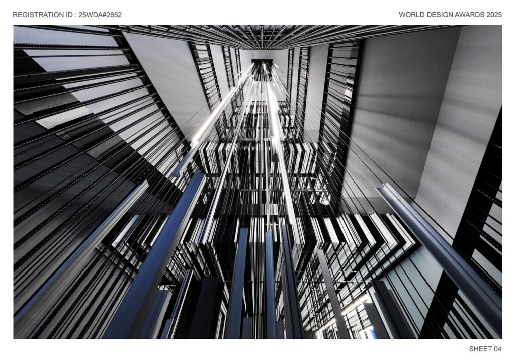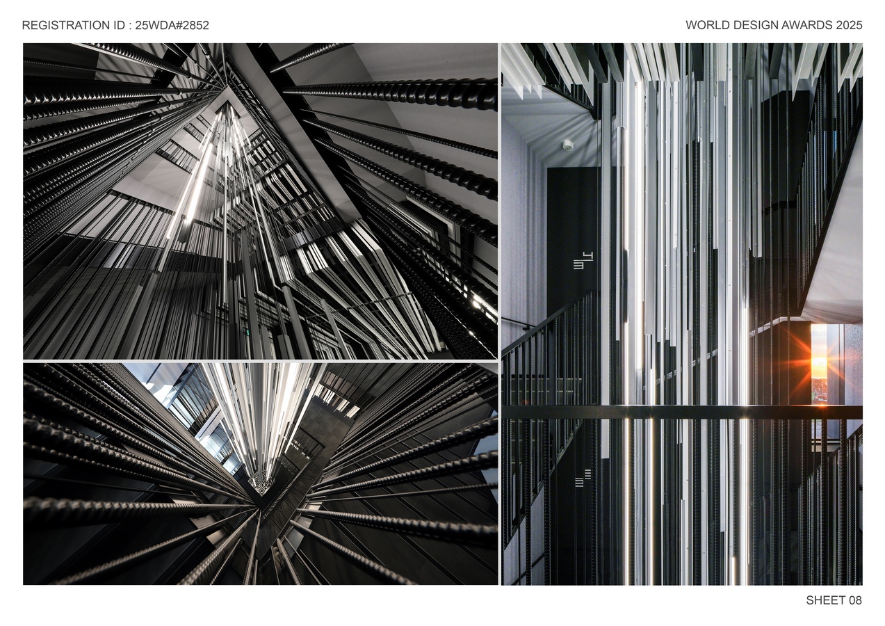 This project, at Kyoei Steel’s Yamaguchi Division, replaces and consolidates aging office and welfare buildings, enhancing site efficiency. By centralizing dispersed office functions, the new building improves productivity and provides a better working environment, while enriching welfare facilities, including dining halls and bathhouses. The exterior design, inspired by steel billets stored at the plant, symbolizes regenerating scrap iron into structural steel. The facade features five stacked billets with varied attributes, enhanced by two vertically divided stairwell volumes, forming a composition of seven billets. Each billet’s unique colors and textures reflect Kyoei Steel’s product diversity and identity in a striking aesthetic. Inside, steel products from the Yamaguchi Division, such as equal-angle steel, flat bars, and deformed bars, are prominently featured as finish materials, celebrating their raw strength and aesthetic potential. Materials like angle steel (L30x30, 50×50, 75×75), flat bars (FB-32, 50), I-bars (I-BAR-44, 75), and deformed bars (10φ, 25φ, 38φ) were used for walls, ceilings, and the company’s barcode pattern. This barcode, serving as a symbol of traceability, embodies the company’s commitment to transparency and accountability in its recycling process, visually connecting material flows with corporate identity. The stairwell features 93 wires (6φ) stretched across 20 meters, with five types of angles and seamless lighting. A QR code of the company’s website is integrated into the horizontal plane, while staircase handrails use randomly arranged angles and deformed steel bars. On the west side, similar steel bars cover the stairwell from floor to penthouse, interacting with handrails and lighting to emphasize verticality. This interplay of light, shadow, and raw steel highlights Kyoei Steel’s technological strength and innovative spirit. Dynamic lighting effects embody the company’s brand identity. By showcasing materials and integrating values, the project harmonizes functionality and design. Rooted in the company’s recycling philosophy, it presents a prototype for architecture merging sustainability, innovation, and identity with a unique spatial experience.