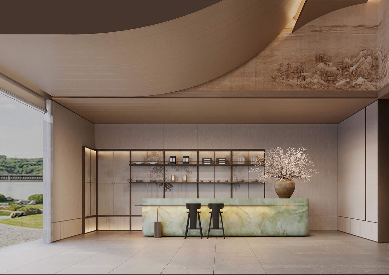 Landscape murals are introduced to the conversation area, embodying the aesthetic of “A Painting at Hand Captures the Landscape a Thousand Miles Away” and conveying the cultural depth of Song-style landscape art. Large-scale glass windows seamlessly blend the indoor space with outdoor mountains and lakes, allowing users to feel as if within the natural landscape. This project utilizes low-carbon materials such as FSC-certified wood panels and bamboo fiber composite panels, which are recyclable while ensuring aesthetic appeal and durability. Moreover, large-scale glass windows are used for maximum natural daylighting, reducing reliance on artificial lighting and reflecting our commitment to sustainability.