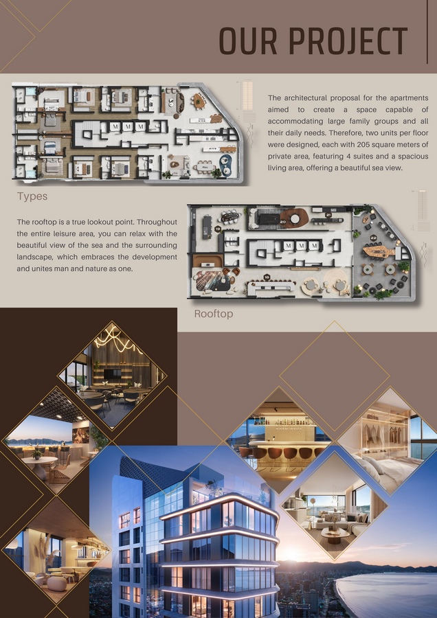 The architectural proposal for the apartments aimed to create a space capable of accommodating large family groups and all their daily needs. Therefore, two units per floor were designed, each with 205 square meters of private area, featuring 4 suites and a spacious living area, offering a beautiful sea view.