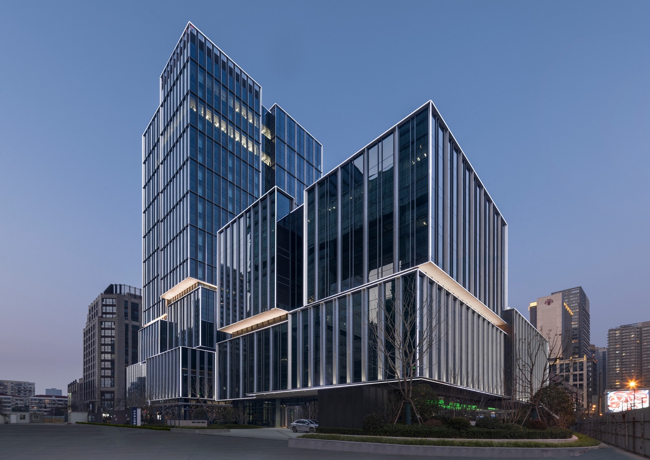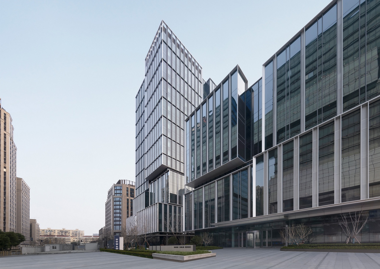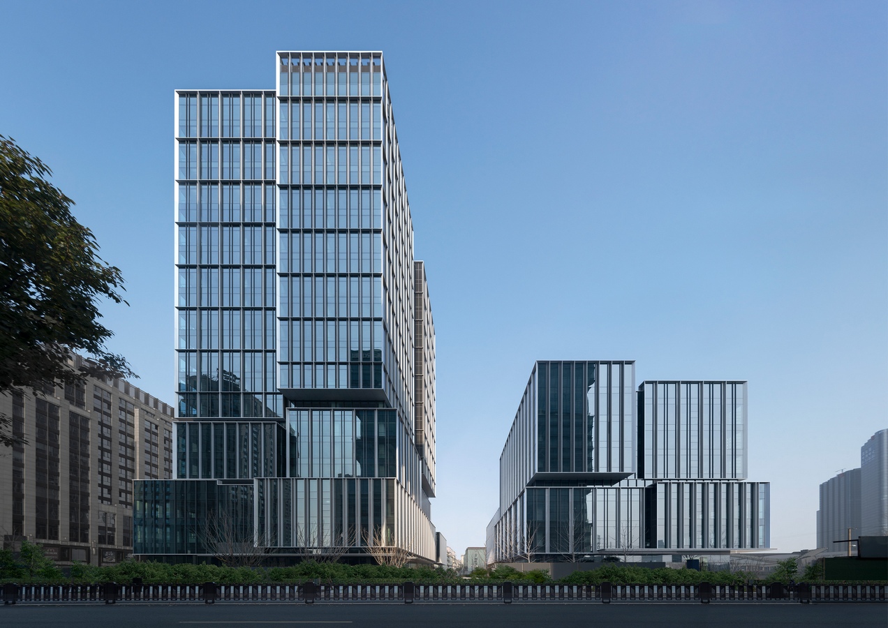 A strategy of volumetric decomposition transforms the overall form into a composition of interlocking cubic masses, mitigating the visual heaviness of the towers and enhancing a human-scale perception. The façade language, derived from vertical linear elements, extends into the landscape and paving design to achieve a unified architectural expression. Silver-gray metal panels and transparent glass create a restrained yet refined urban interface, reflecting Putuo District’s aspiration for a “Beautiful City.”