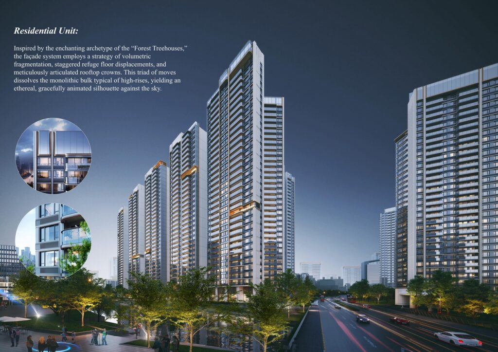 Inspired by the enchanting archetype of the “Forest Treehouses,” the façade system employs a strategy of volumetric fragmentation, staggered refuge floor displacements, and meticulously articulated rooftop crowns. This triad of moves dissolves the monolithic bulk typical of high-rises, yielding an ethereal, gracefully animated silhouette against the sky. A consciously selected material palette – featuring curved glazing, recycled aluminum cladding, and fine-grained metallic mesh – achieves superior thermal performance while bestowing upon the architecture a contemporary yet warmly tactile, eco-conscious identity. Sky gardens and cascading vertical greening systems further efface the delineation between built form and living ecology, effectuating a holistic, verdant inhabitation of the “Fifth Façade.”