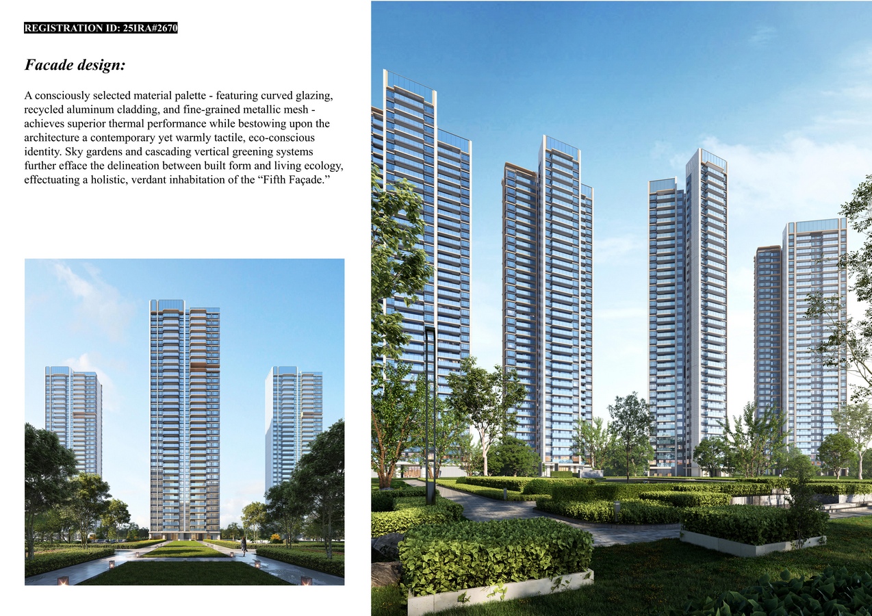 Inspired by the enchanting archetype of the “Forest Treehouses,” the façade system employs a strategy of volumetric fragmentation, staggered refuge floor displacements, and meticulously articulated rooftop crowns. This triad of moves dissolves the monolithic bulk typical of high-rises, yielding an ethereal, gracefully animated silhouette against the sky. A consciously selected material palette – featuring curved glazing, recycled aluminum cladding, and fine-grained metallic mesh – achieves superior thermal performance while bestowing upon the architecture a contemporary yet warmly tactile, eco-conscious identity. Sky gardens and cascading vertical greening systems further efface the delineation between built form and living ecology, effectuating a holistic, verdant inhabitation of the “Fifth Façade.”