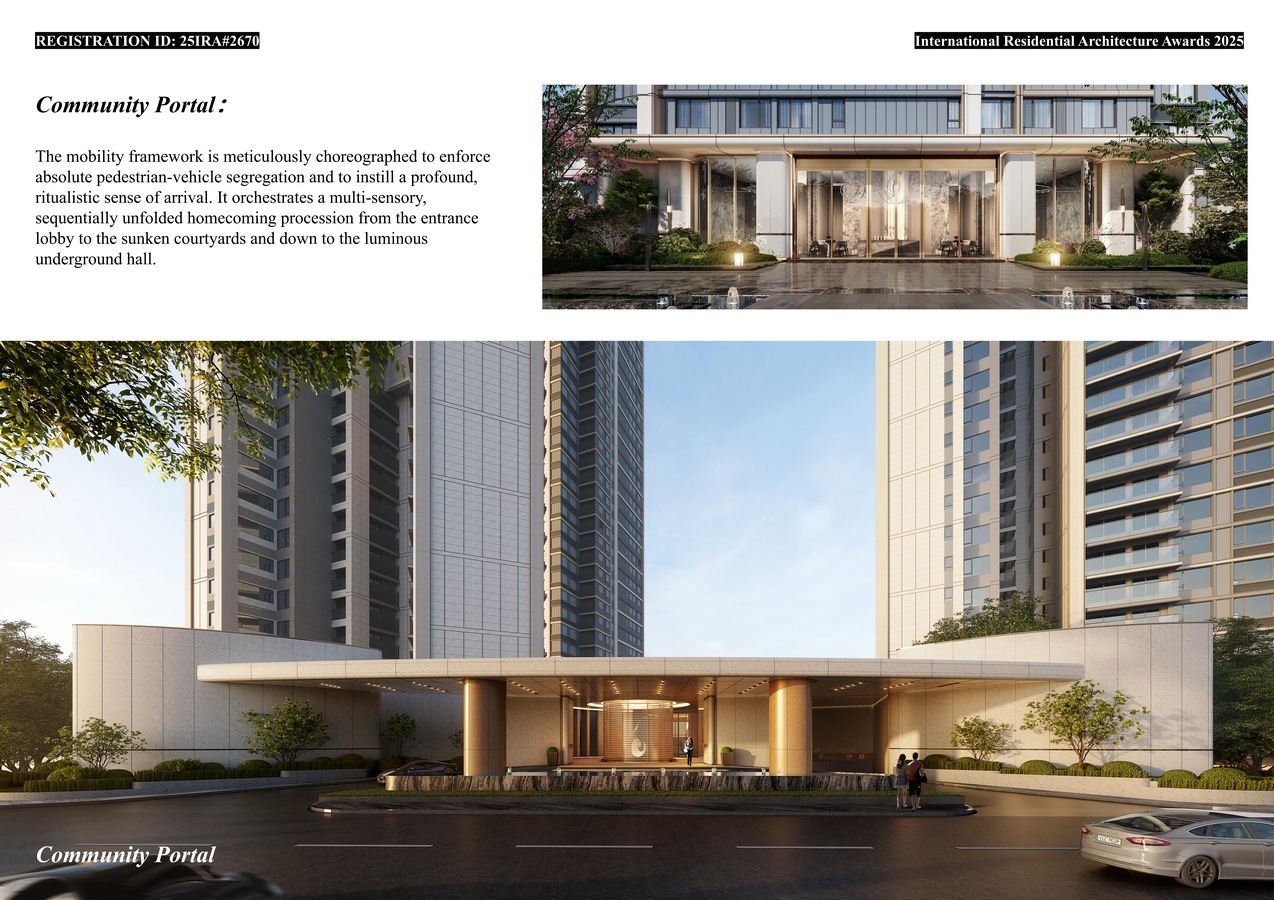 The mobility framework is meticulously choreographed to enforce absolute pedestrian-vehicle segregation and to instill a profound, ritualistic sense of arrival. It orchestrates a multi-sensory, sequentially unfolded homecoming procession from the entrance lobby to the sunken courtyards and down to the luminous underground hall. As the community’s core amenity, the clubhouse integrates a heated pool, fitness center, and private dining suite, adopting natural lighting and ventilation strategies to create a low-energy, high-comfort shared living hub.