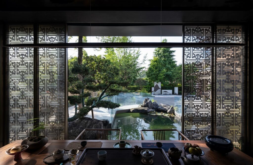 The outdoor swastika style tea pavilion connects with nature