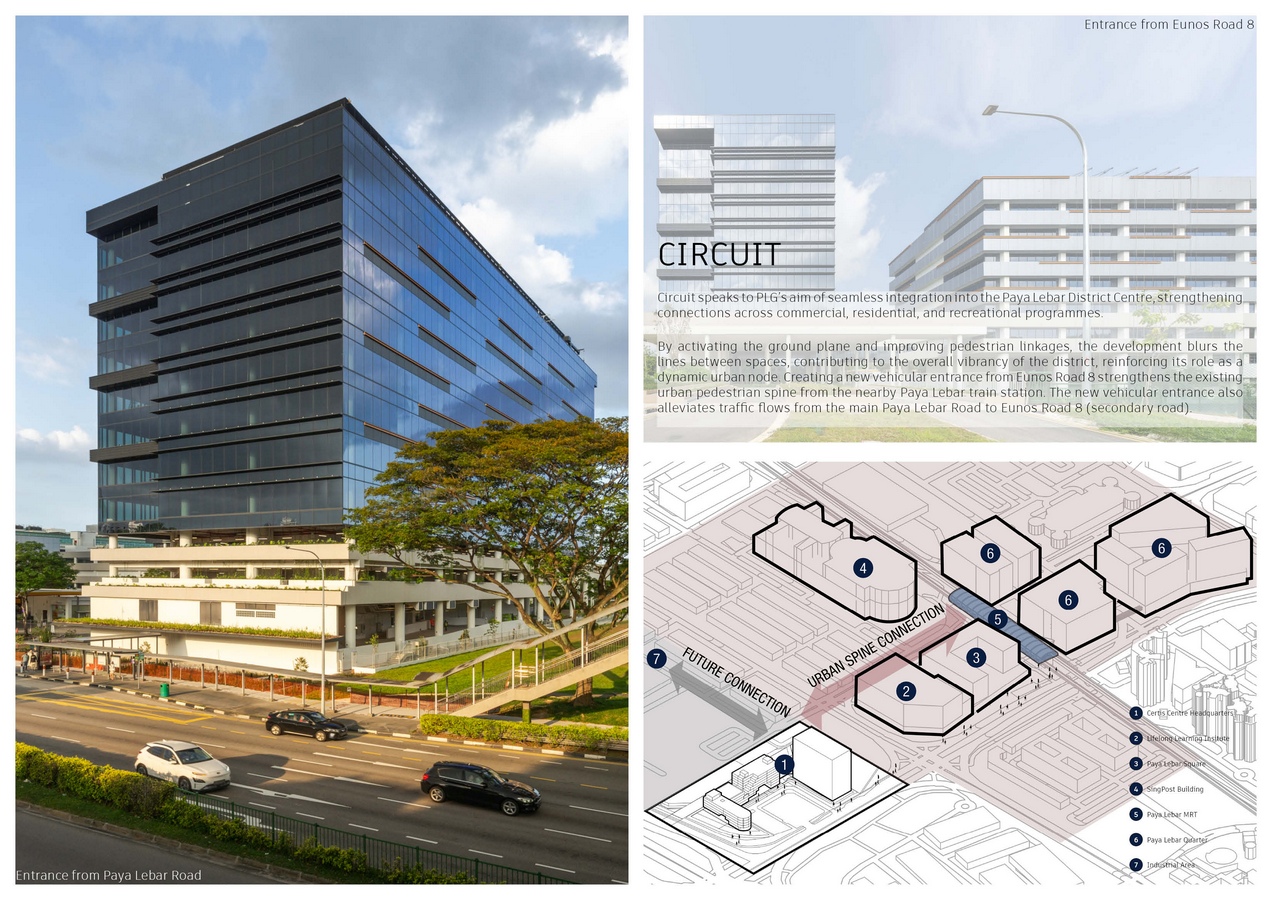 Circuit speaks to PLG’s aim of seamless integration into the Paya Lebar District Centre, strengthening connections across commercial, residential and recreational programmes. By activating the ground plane and improving pedestrian linkages, the development blurs the lines between spaces, contributing to the overall vibrancy of the district, reinforcing its role as a dynamic urban node. Creating a new vehicular entrance from Eunos Road 8, the design strengthens the existing urban pedestrian spine from the nearby Paya Lebar train station. The new vehicular entrance also alleviates traffic flows from the main Paya Lebar Road to Eunos Road 8 (secondary road).