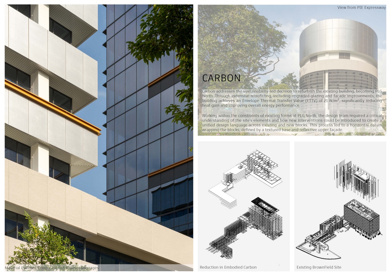 Carbon addresses the sustainability-led decision to refurbish the existing building, becoming PLG North. Through extensive retrofitting, including upgraded glazing and façade improvements, the building achieves an Envelope Thermal Transfer Value (ETTV) of 21 W/m², significantly reducing heat gain and improving overall energy performance. Working within the constraints of existing forms at PLG North, the design team required a critical understanding of the site’s elements and how new interventions could be introduced to create a unified design language across existing and new blocks. This process led to a horizontal datum wrapping the blocks, defined by a textured base and reflective upper façade.