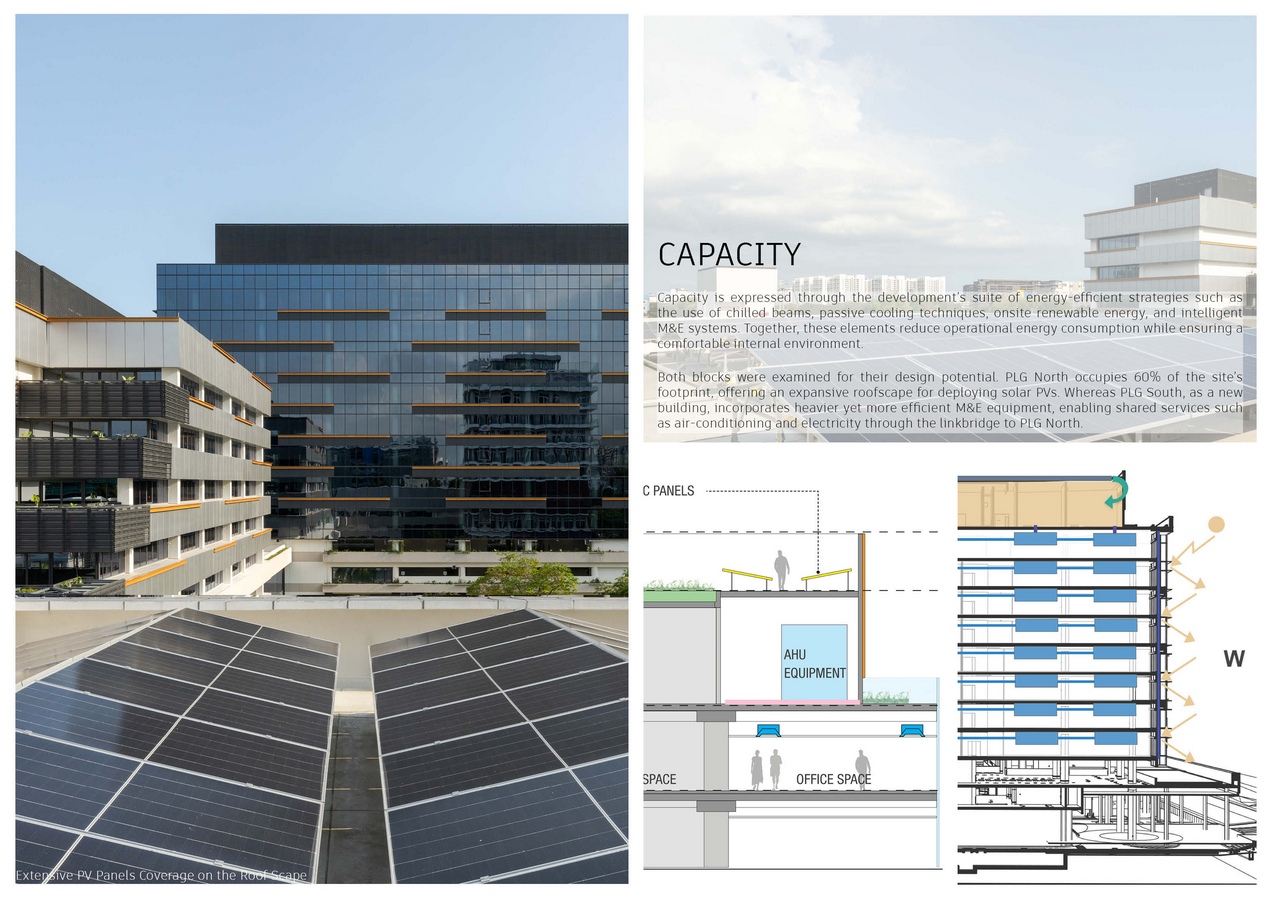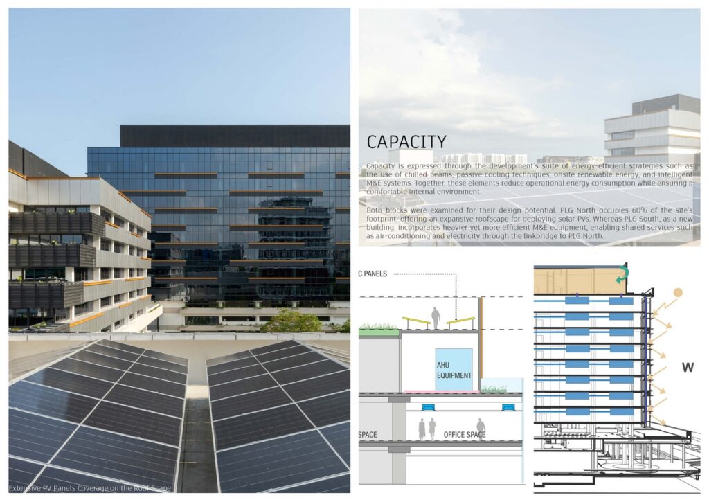 Capacity is expressed through the development’s suite of energy-efficient strategies, such as the use of chilled beams, passive cooling techniques, onsite renewable energy, and intelligent M&E systems. Together, these elements reduce operational energy consumption while ensuring a comfortable internal environment.