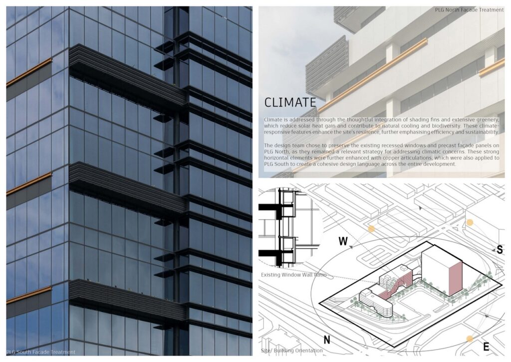 Climate is addressed through the thoughtful integration of shading fins and extensive greenery, which reduce solar heat gain and contribute to natural cooling and biodiversity. These climate-responsive features enhance the site’s resilience, further emphasising efficiency and sustainability. The preserved recessed windows and precast façade panels on PLG North remained a relevant strategy for addressing climatic concerns. These strong horizontal elements were further enhanced with copper articulations, which were also applied to PLG South to create a cohesive design language across the entire development.