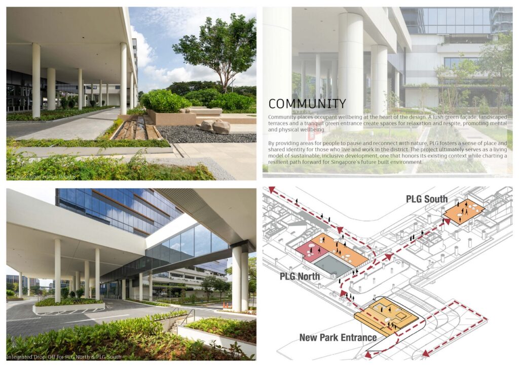 Community places occupant wellbeing at the heart of the design. A lush green façade, landscaped terraces and a tranquil green entrance create spaces for relaxation and respite, promoting mental and physical wellbeing. By providing areas for people to pause and reconnect with nature, PLG fosters a sense of place and shared identity for those who live and work in the district. The project ultimately serves as a living model of sustainable, inclusive development—one that honours its existing context while charting a resilient path forward for Singapore’s built environment.