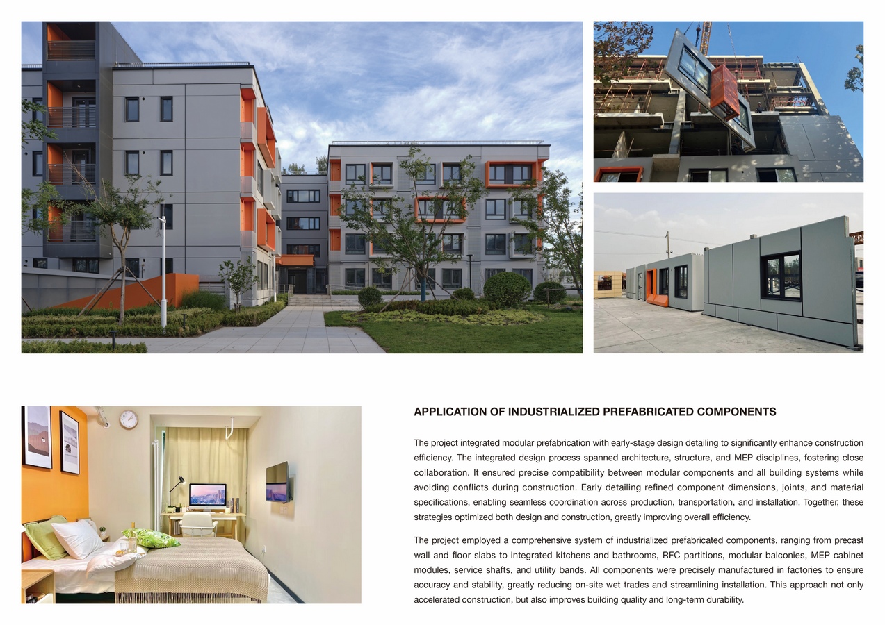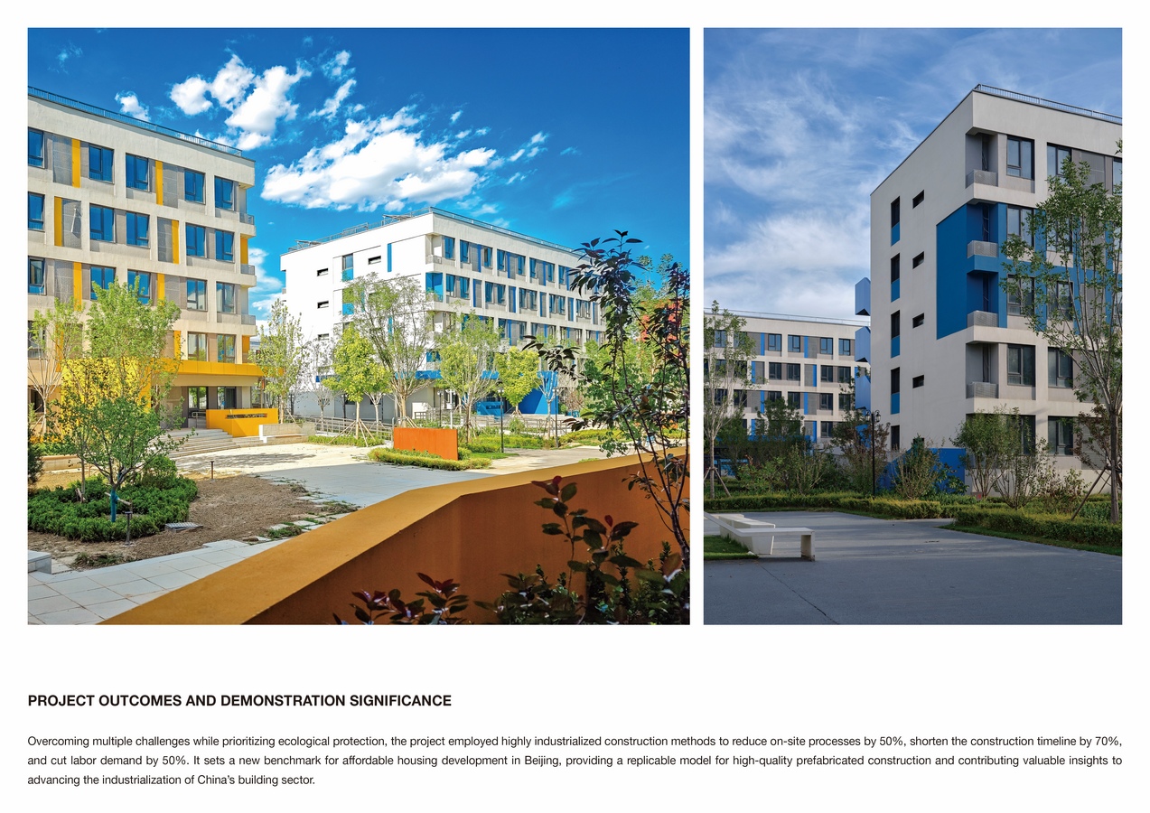 Project Outcomes and Demonstration Significance Overcoming multiple challenges while prioritizing ecological protection, the project employed highly industrialized construction methods to reduce on-site processes by 50%, shorten the construction timeline by 70%, and cut labor demand by 50%. It sets a new benchmark for affordable housing development in Beijing, providing a replicable model for high-quality prefabricated construction and contributing valuable insights to advancing the industrialization of China’s building sector.