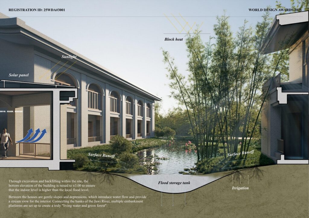 The Second Construction Limited Company of China Construction Eighth Engineering Division Design and Research Institute: Winner of World Design Awards 2025. The project is located in Seberang Perai, Penang State, Malaysia. To the north of the site are a power transformation substation and a gymnasium; to the west lies an existing residential area; to the south is a planned expressway development project; to the east is the Jawi River, with an open space lying between the Jawi River and the site. The east side of the Jawi River is planned as an industrial zone, and the surrounding functions of the site are blended, with various types of land uses mixed. The south and west sides of the site are connected to municipal roads, but the south side is planned for an expressway with unknown conditions. The overall traffic situation is relatively poor; meanwhile, to avoid the main entrance being designed under a bridge, the entrance and exit are designed on the planned road determined on the west side.phasizing a fluid internal circulation that guides visitors across the site.