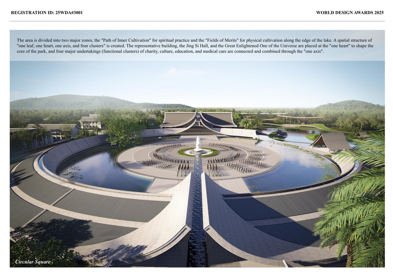 Design concept: The design concept is inspired by the Bodhi leaf, introducing the design idea of “Salvation Through Charity to Others with A Leaf of Bodhi.” The entire area is designed based on the principles of continuing the Tzu Chi spirit, focusing on expressing the design philosophy of harmony between humanity and nature and the unity of heaven and man. By utilizing the existing wetland resources within the site, a lake surface in the shape of Bodhi leaves is created, forming the design intention of “the tip of the Bodhi leaf pointing toward a beautiful place afar, planting red beans, and signifying a longing (for the Master).” The area is divided into two major zones, the “Path of Inner Cultivation” for spiritual practice and the “Fields of Merits” for physical cultivation along the edge of the lake. A spatial structure of “one leaf, one heart, one axis, and four clusters” is created. The representative building, the Jing Si Hall, and the Great Enlightened One of the Universe are placed at the “one heart” to shape the core of the park, and four major undertakings (functional clusters) of charity, culture, education, and medical care are connected and combined through the “one axis”.