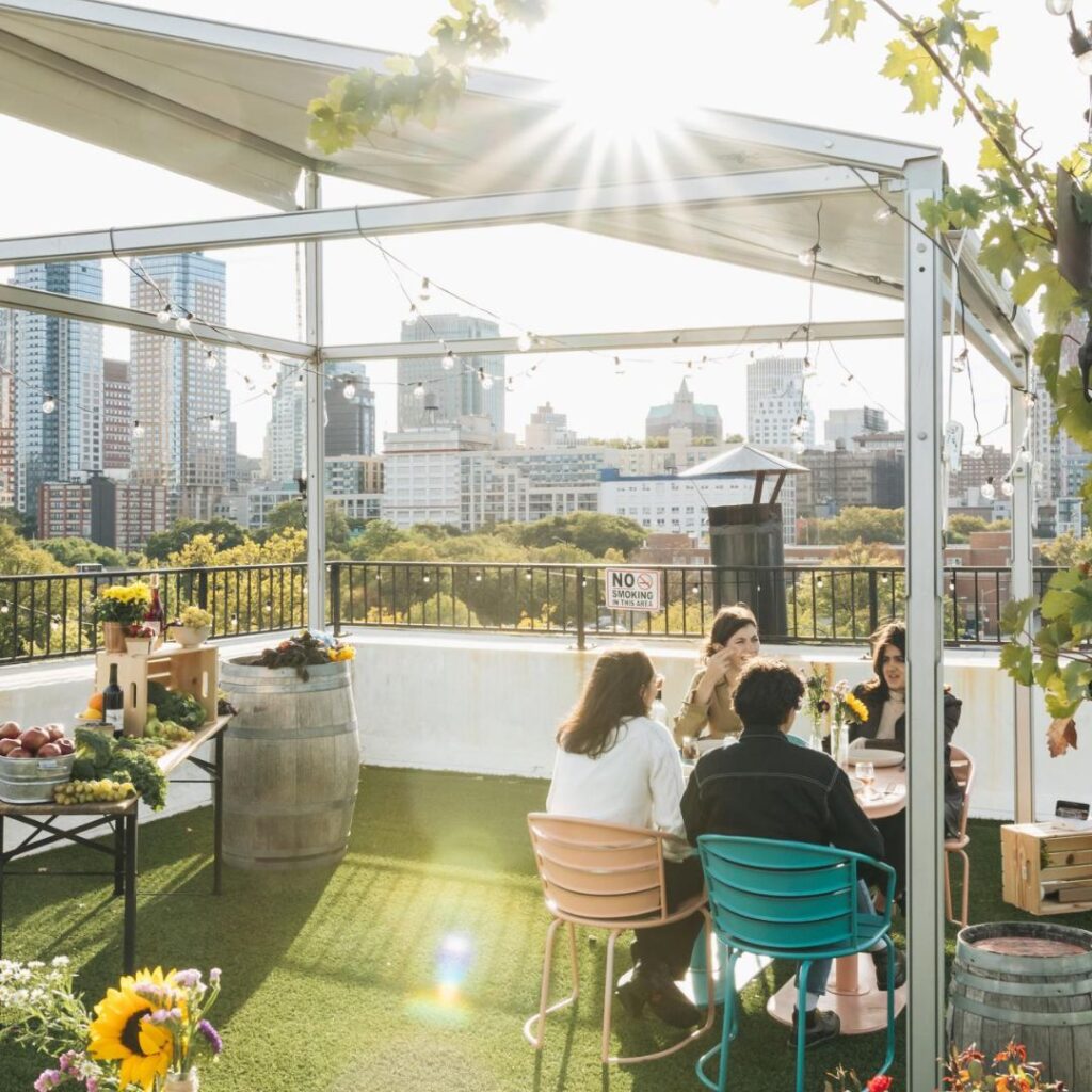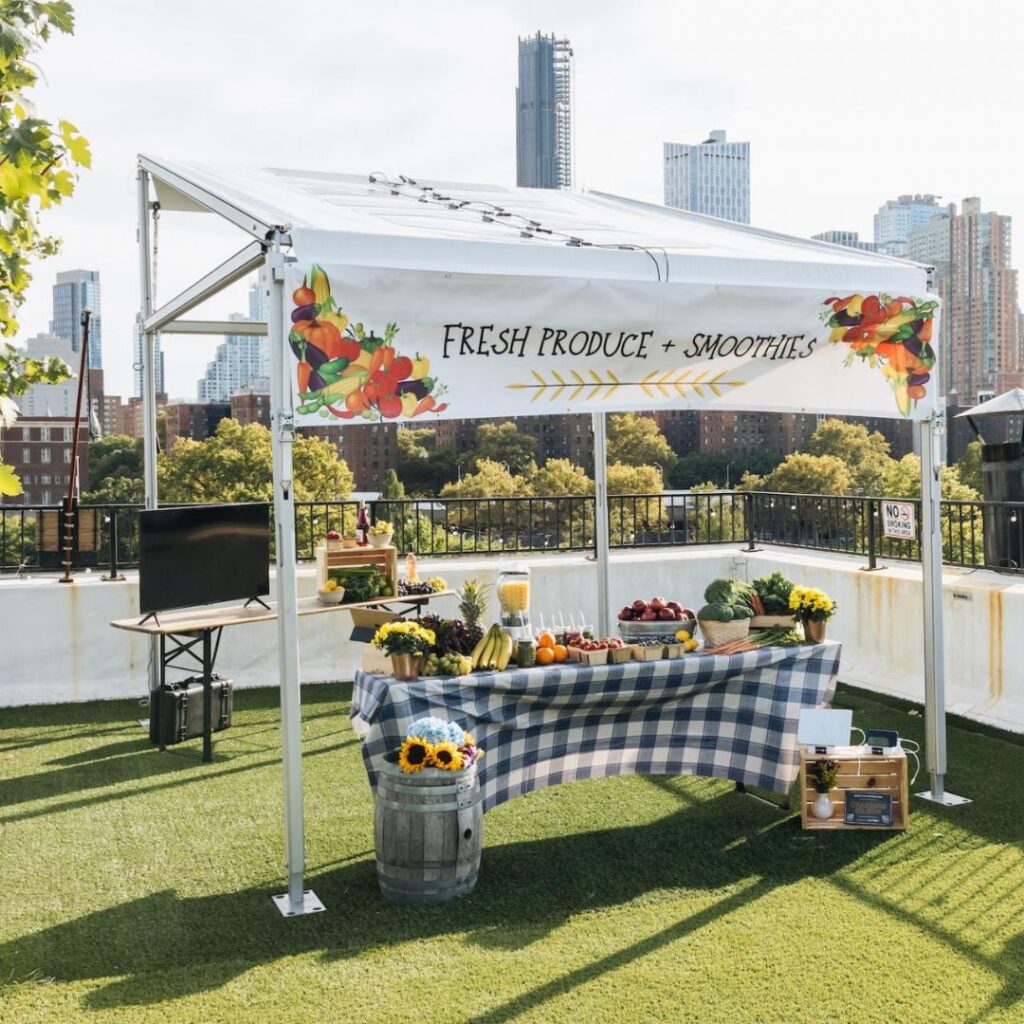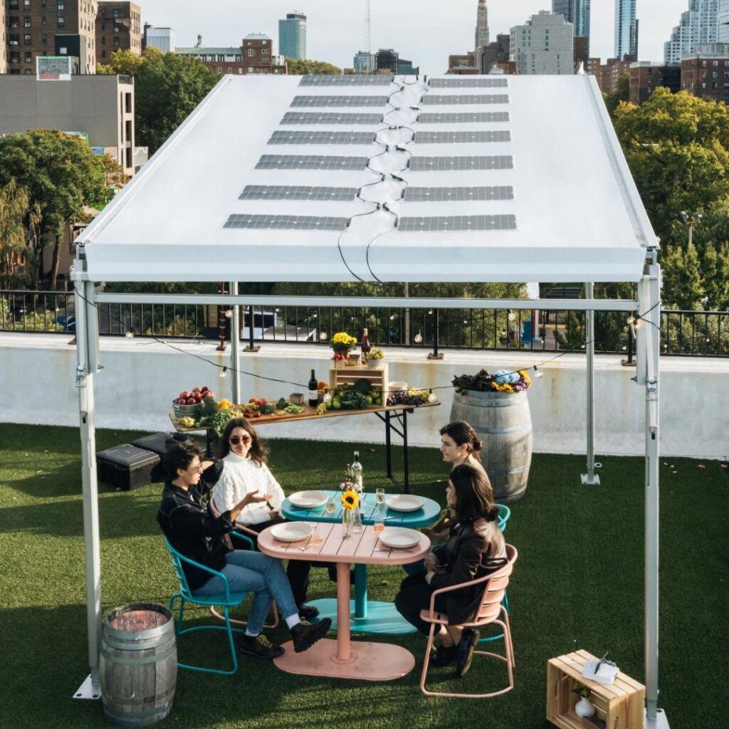 This particular application was designed for events held at a Brooklyn-based rooftop wine bar and vineyard. When erected in a space that receives plenty of sunlight, this canopy provides over 1000W of solar power. For events that require more shade and power, multiple canopies can be easily set up and connected.