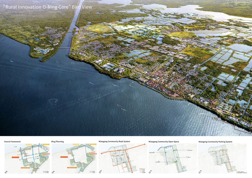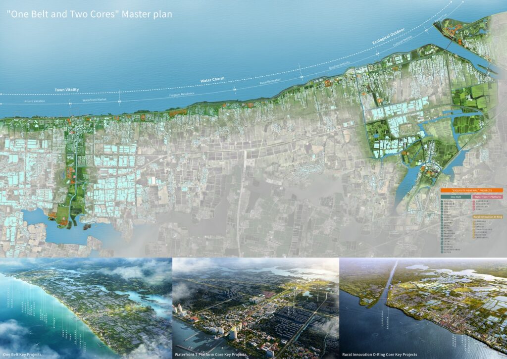 DEDANG DESIGN: Winner of World Design Awards 2025. The “One Belt and Two Cores” key area urban design project in Qidu Town covers about 15.5 square kilometers, with clear functional divisions. The “One Belt” is the South Taihu Scenic Belt, extending 200 meters south along South Taihu Avenue as the ecological and landscape backbone. The “Two Cores” include the “Waterfront T-Platform Core” (from South Taihu Avenue north to Jinyu Yang along Wanghu Road and Wulou River, undertaking public services and leisure functions) and the “Rural Innovation O-Ring Core” (covering Miaogang Community, Jiangcun Cultural Park, Pujiangyuan Smart Farm and Ecological Island, promoting integrated rural development).