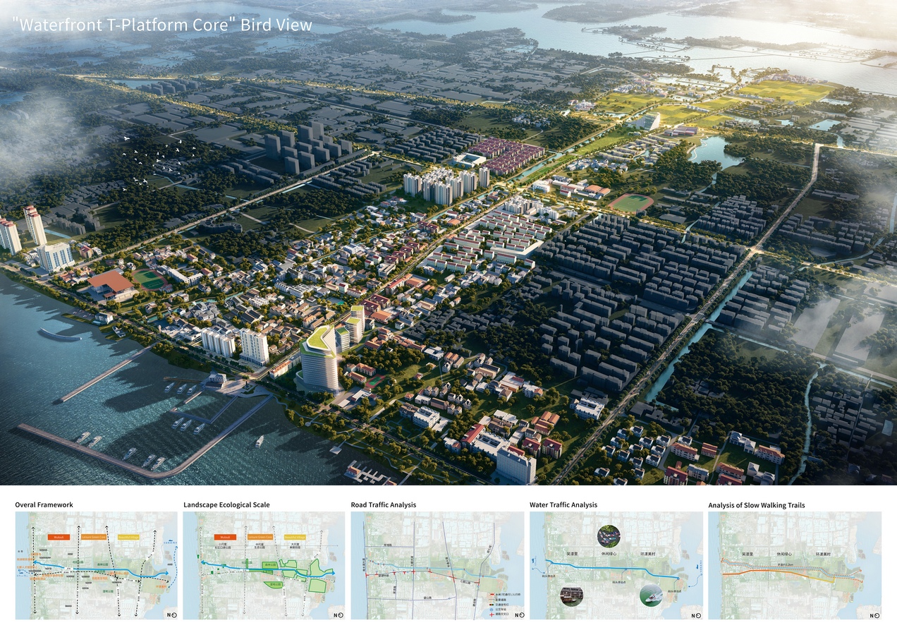 Functionally, the South Taihu Scenic Belt (positioned as “China’s First YOUNG Elderly Bay”) integrates “Lougang-lake-wetland-shoreline” resources to create seven thematic neighborhoods (Leisure Vacation, Waterfront Market, Fragrant Residence, Rural Recreation, Outdoor Activity, Cultural Retreat, Forest Fun), forming a “visitable, livable, workable” space with clear architectural control (sloped roofs, dark colors, tile materials). The “Waterfront T-Platform” uses a “T-shaped axis” to gather commercial, residential and cultural functions, dividing into “Wulouli” (activating via pocket spaces and lanes), “Leisure Green Core” (ecological green lung with parks) and “Beautiful Village” (rural tourism integration). The “Rural Innovation O-Ring” connects resources via an “O-shaped loop”, fostering “research + health care + smart agriculture” and industrializing the “Jiangcun Culture” IP.