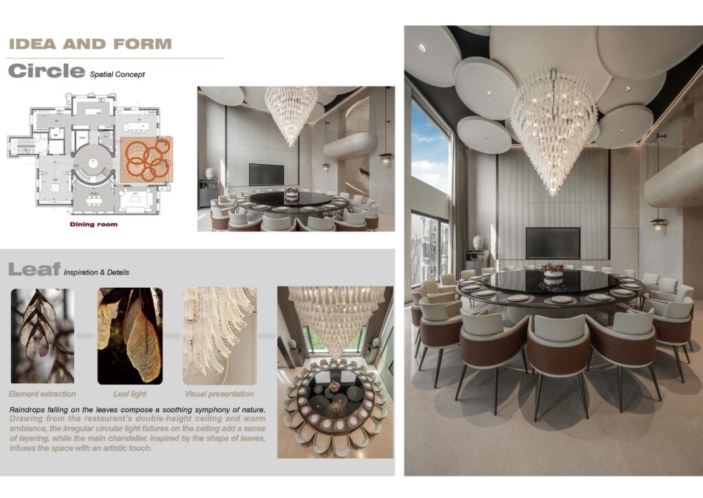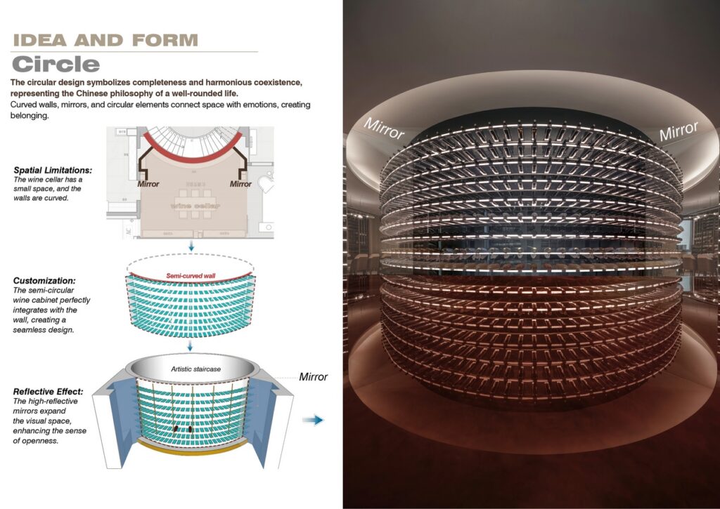 The circle, symbolizing completeness and harmony, reflects the Chinese philosophical concept of “unity of heaven and humanity.” It’s a totem revered in Chinese culture for its emphasis on harmony. Circular design explores the connection between space and emotional needs.