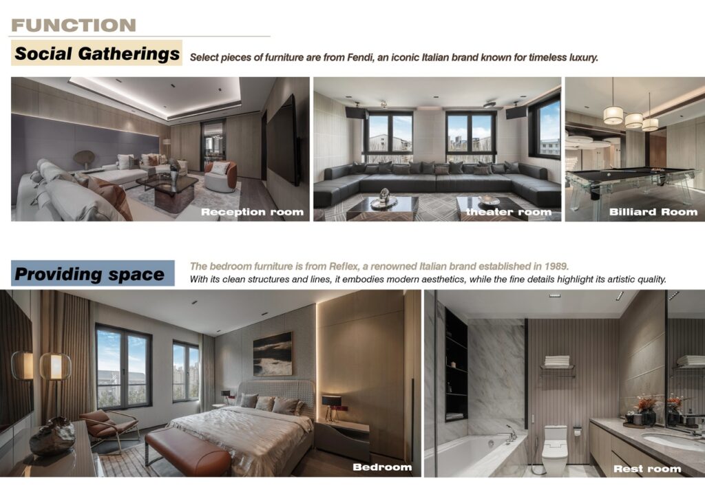 The goal is to create a high-end mansion that is both private and conducive to social interaction, providing a place for the homeowner to relax both mentally and physically. Functional spaces such as the dining room, wine cellar, and teppanyaki restaurant enhance social interactions, while the home theater and bedrooms cater to privacy needs. The layout and elements are meticulously designed to create an environment that is both comfortable and encourages interaction.