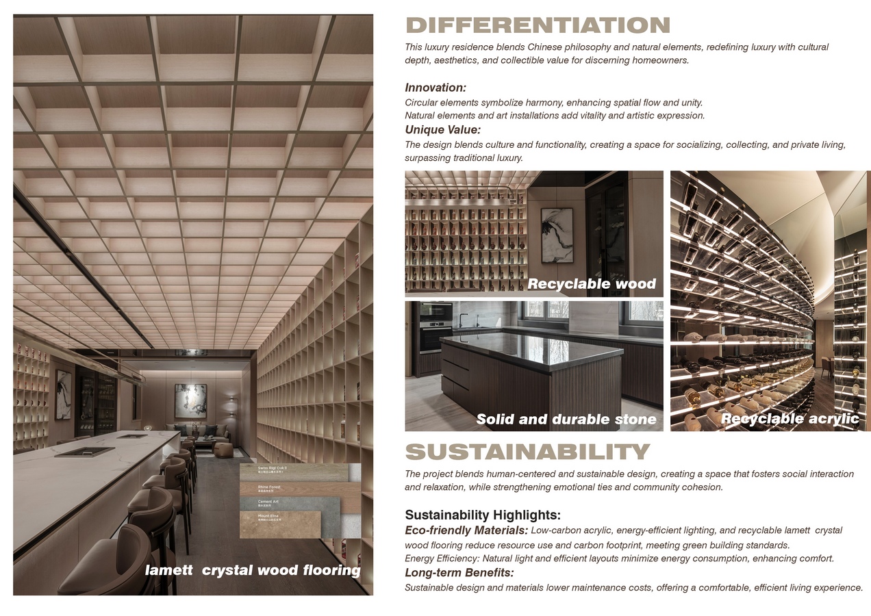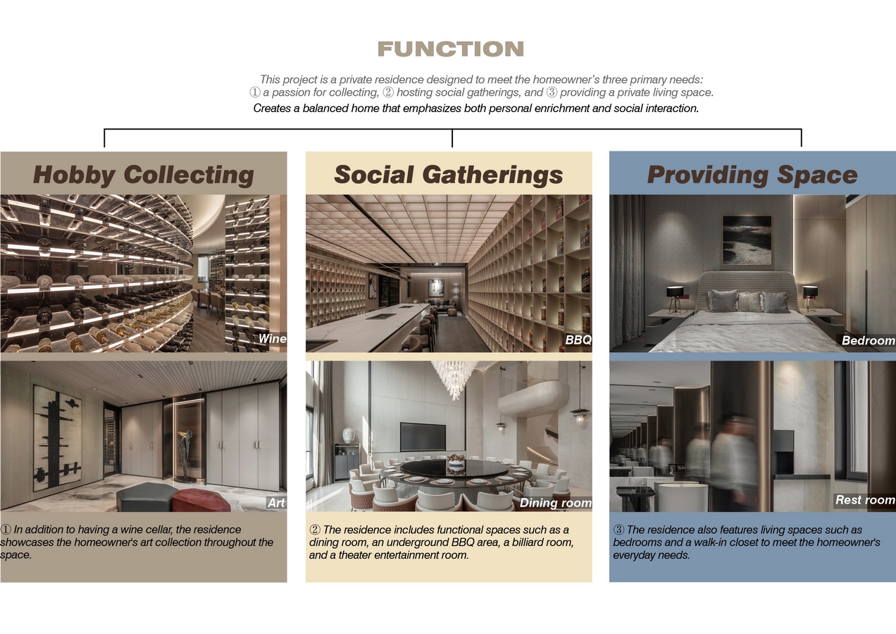 Kris Lin International Design: Winner of World Design Awards 2025. A.Purpose: This project is designed as a private mansion for an owner who has a passion for collecting fine wines and artworks, and often invites friends and family to share good food and wine. The design goal is to create a home that also embodies the atmosphere of an art gallery.