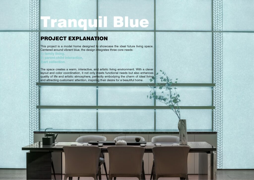 Kris Lin International Design: Winner of International Residential Architecture Awards 2025. This project is a model home designed to showcase the ideal future living space. Centered around vibrant blue, the design integrates three core needs: 1. family living, 2. parent-child interaction, and 3. art collection. The space creates a warm, interactive, and artistic living environment. With a clever layout and color coordination, it not only meets functional needs but also enhances quality of life and artistic atmosphere, perfectly embodying the charm of ideal living and attracting customers’ attention, inspiring their desire for a beautiful home.