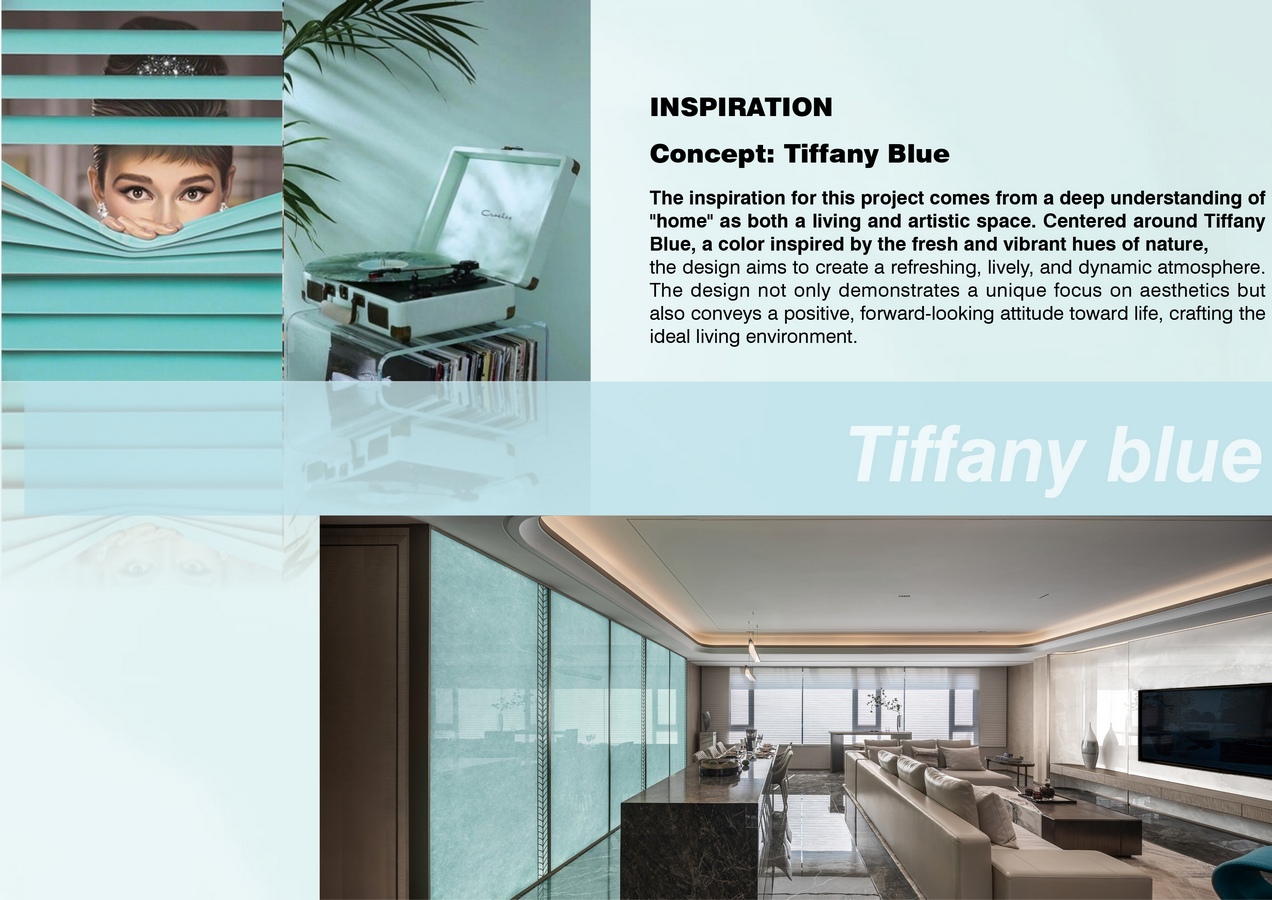 The inspiration for this project comes from a deep understanding of “home” as both a living and artistic space. Centered around Tiffany Blue, a color inspired by the fresh and vibrant hues of nature, the design aims to create a refreshing, lively, and dynamic atmosphere. The design not only demonstrates a unique focus on aesthetics but also conveys a positive, forward-looking attitude toward life, crafting the ideal living environment.