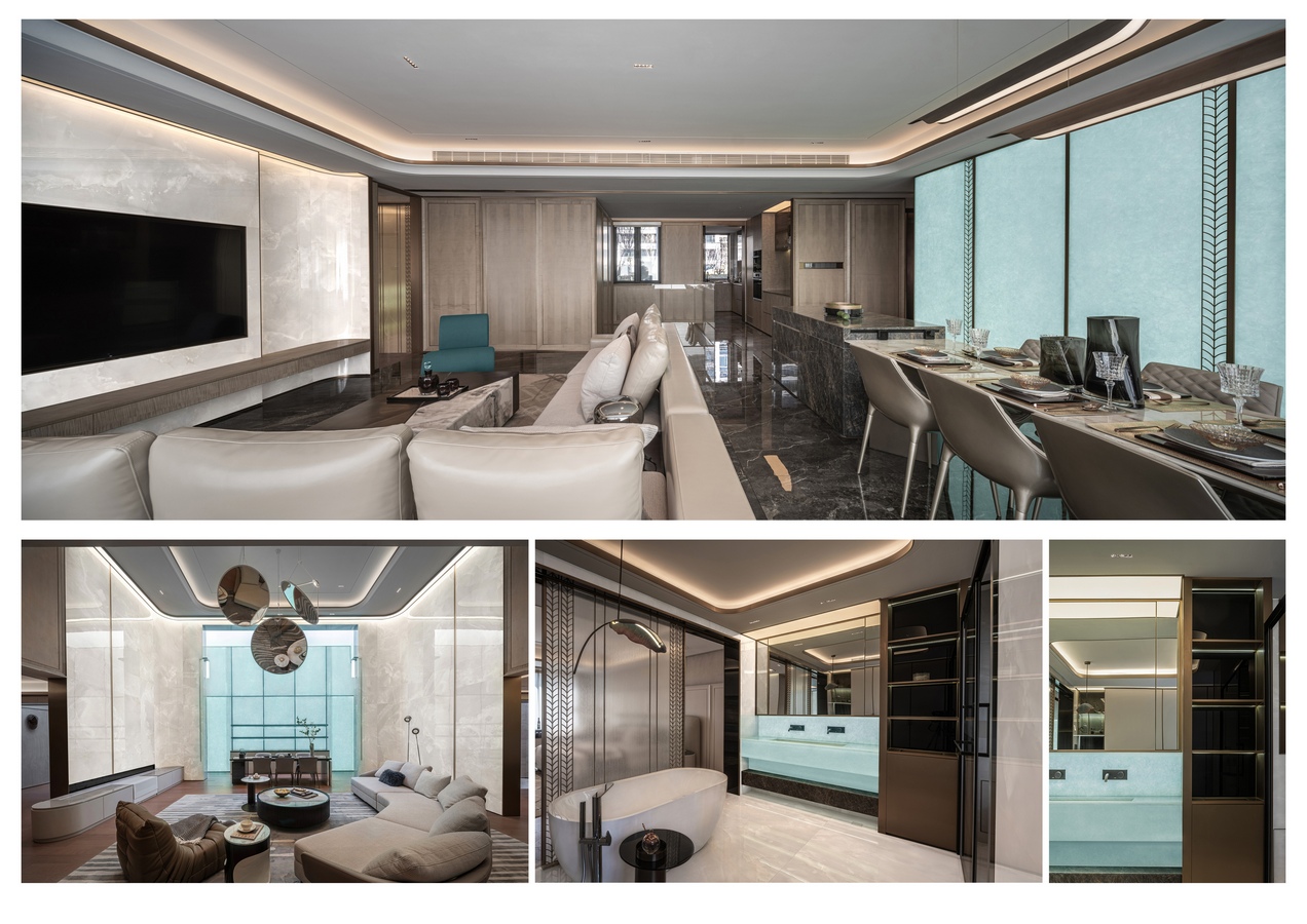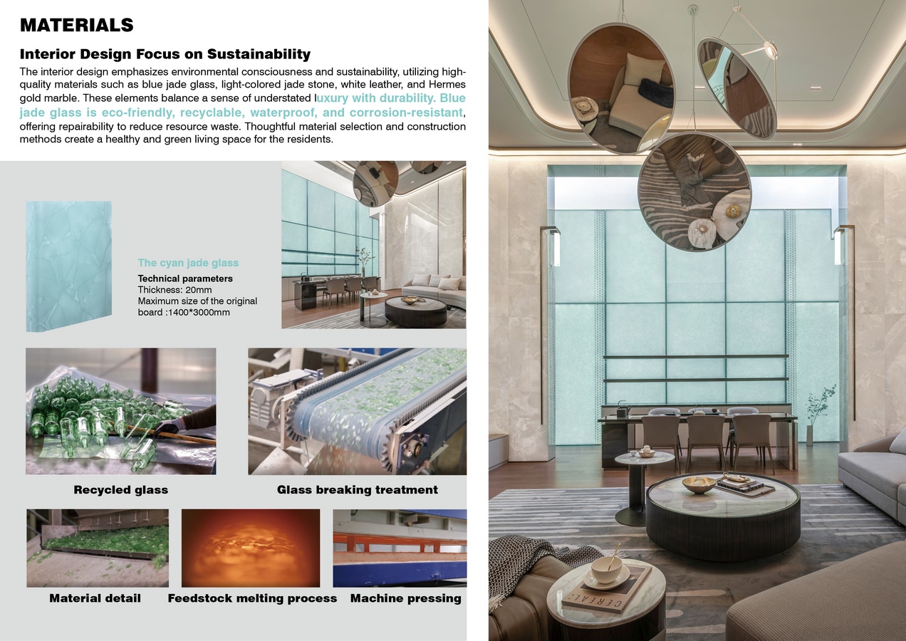 The interior design emphasizes environmental consciousness and sustainability, utilizing high-quality materials such as blue jade glass, light-colored jade stone, white leather, and Hermes gold marble. These elements balance a sense of understated luxury with durability. Blue jade glass is eco-friendly, recyclable, waterproof, and corrosion-resistant, offering repairability to reduce resource waste. Thoughtful material selection and construction methods create a healthy and green living space for the residents.