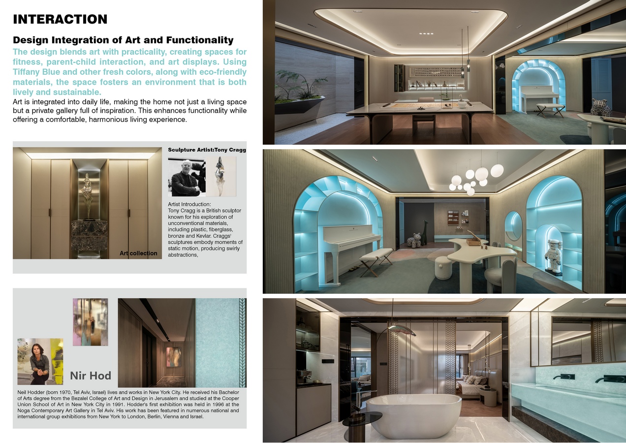 The design blends art with practicality, creating spaces for fitness, parent-child interaction, and art displays. Using Tiffany Blue and other fresh colors, along with eco-friendly materials, the space fosters an environment that is both lively and sustainable. Art is integrated into daily life, making the home not just a living space but a private gallery full of inspiration. This enhances functionality while offering a comfortable, harmonious living experience.