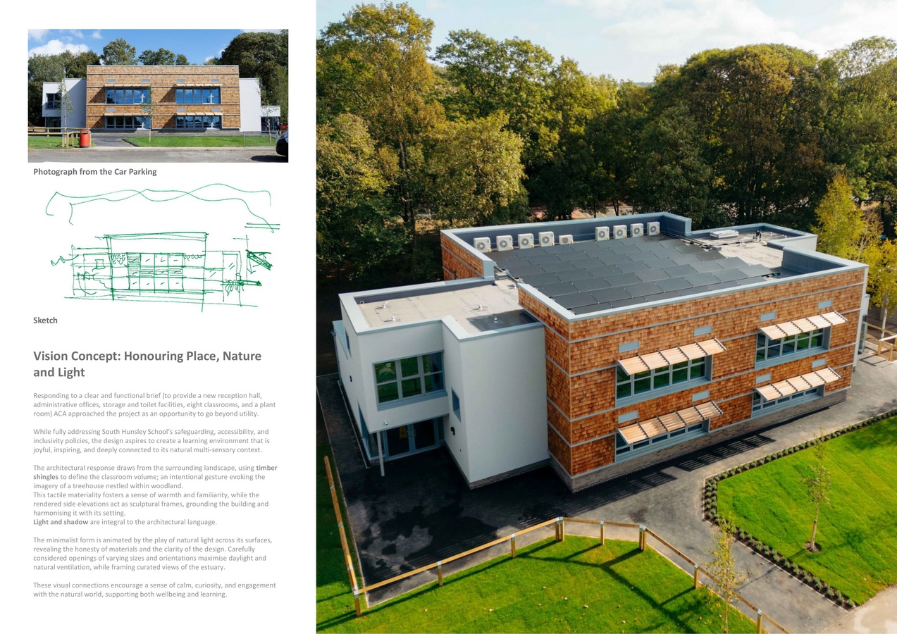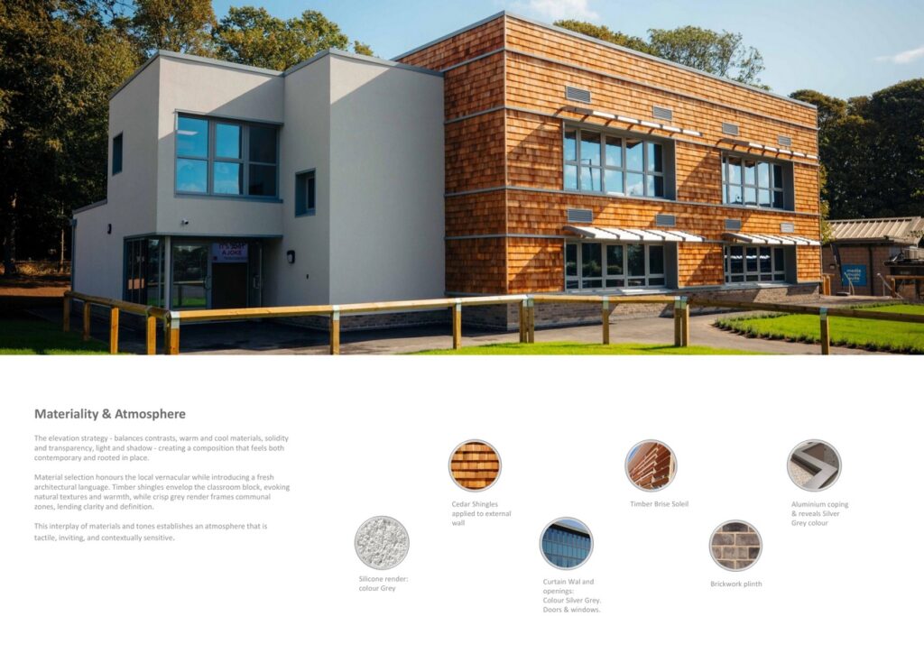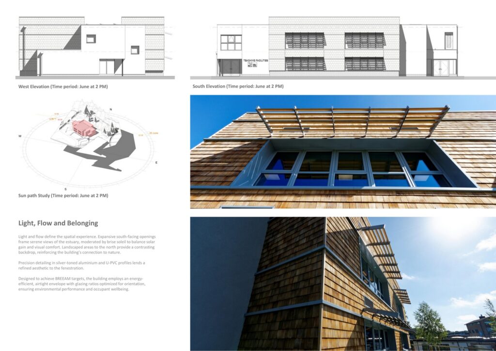 The architectural concept draws inspiration from the Humber Estuary’s natural rhythms, translating them into a form that harmonizes with its context while projecting a bold, contemporary identity. Timber shingles wrap the classroom block in a tactile skin, evoking the warmth of a treehouse and reinforcing biophilic principles. Rendered side elevations act as sculptural frames, balancing material honesty with contextual sensitivity.
