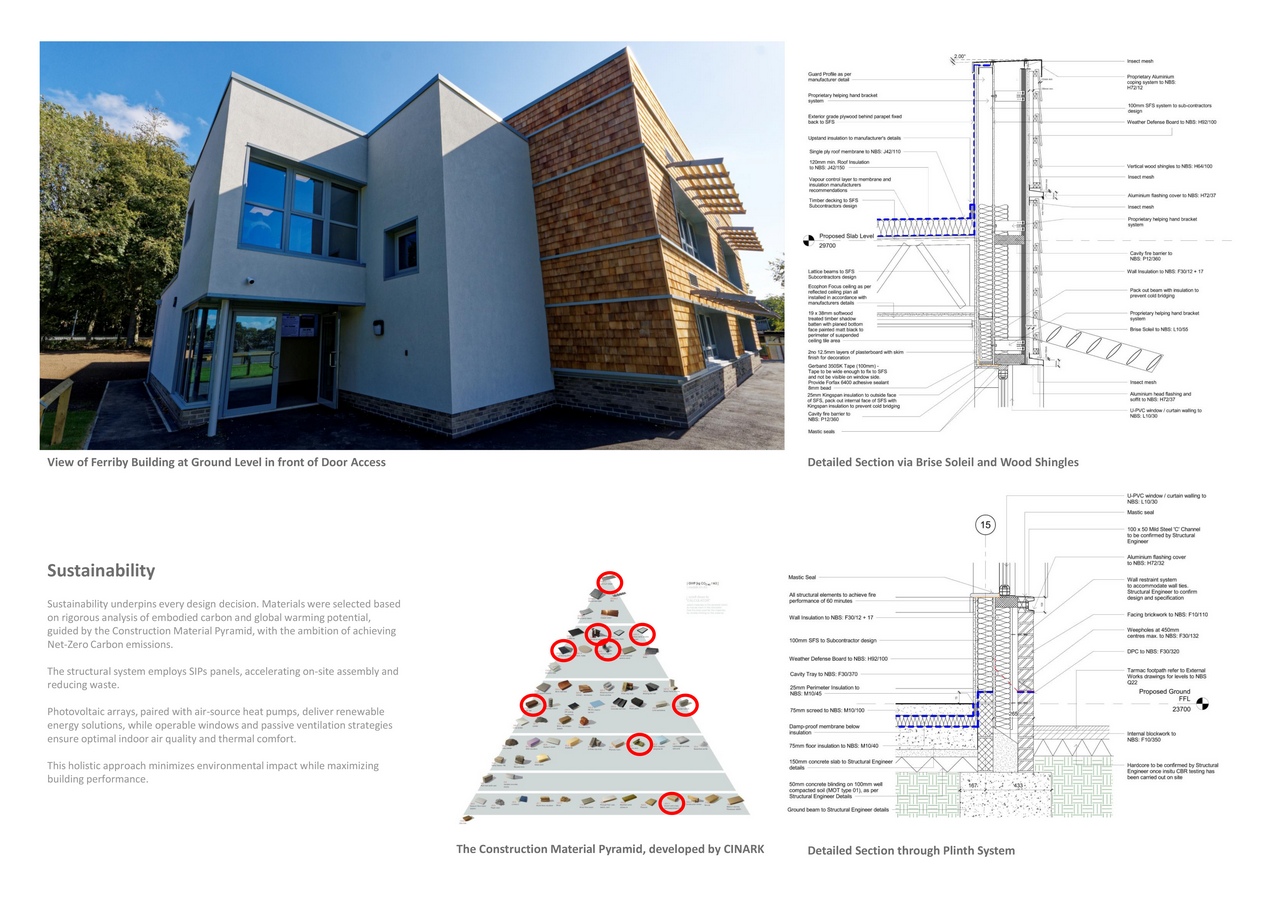 Sustainability underpins every aspect of the Ferriby Building’s conception and delivery. The design incorporates energy-efficient systems, maximises natural daylight, and utilises passive ventilation to reduce operational energy demand. The use of responsibly sourced timber and locally produced materials further minimises embodied carbon, while the surrounding landscape has been enhanced to promote biodiversity and ecological resilience.