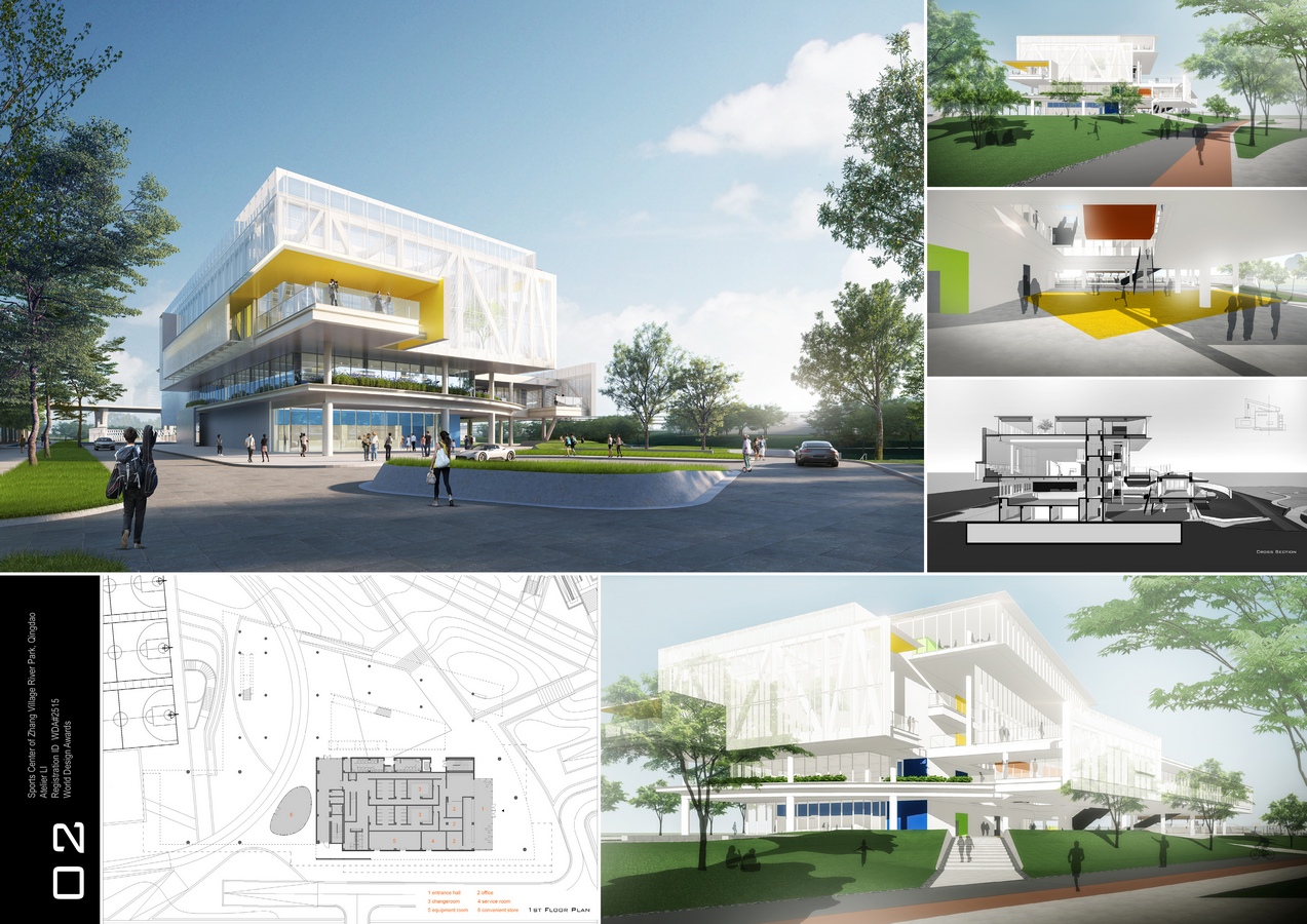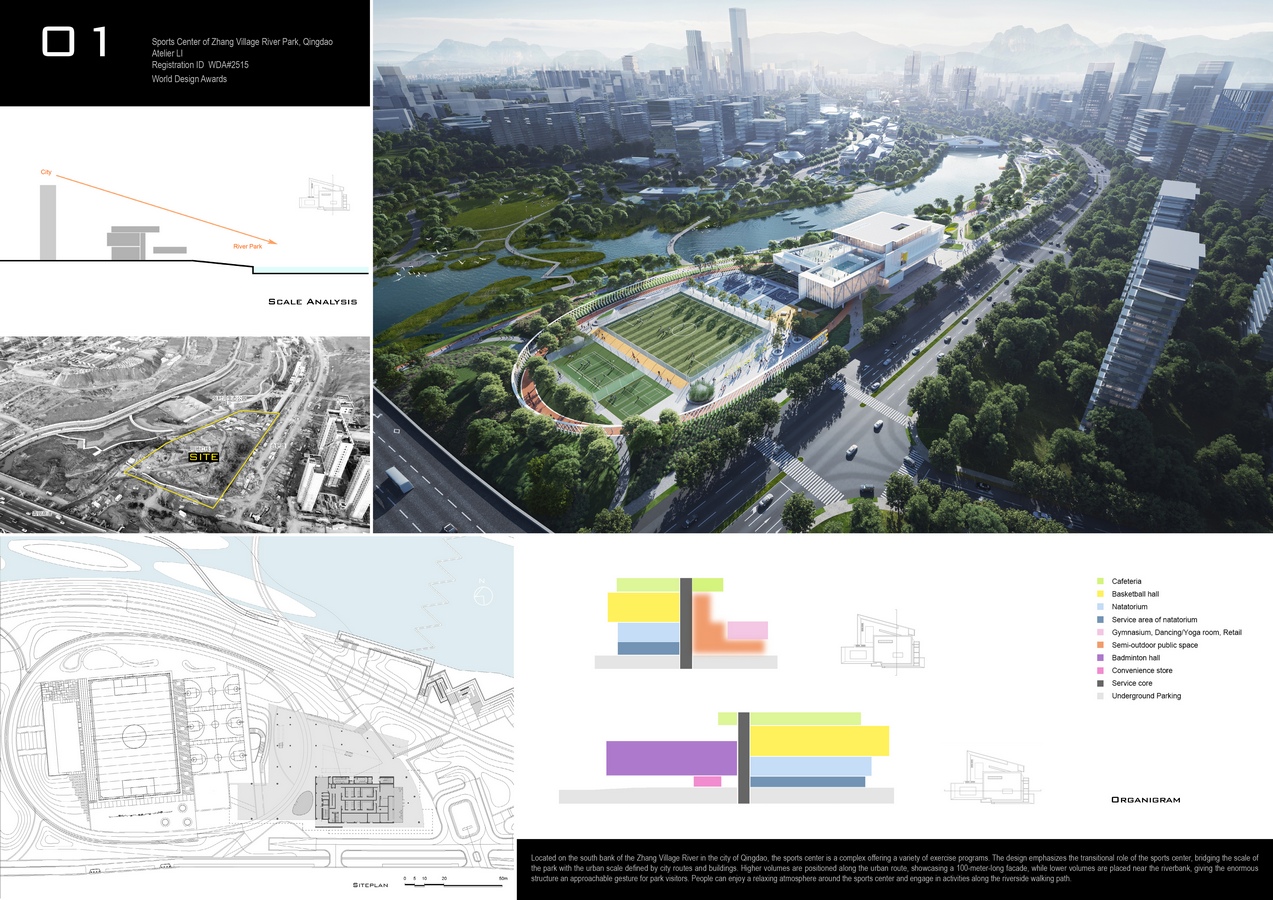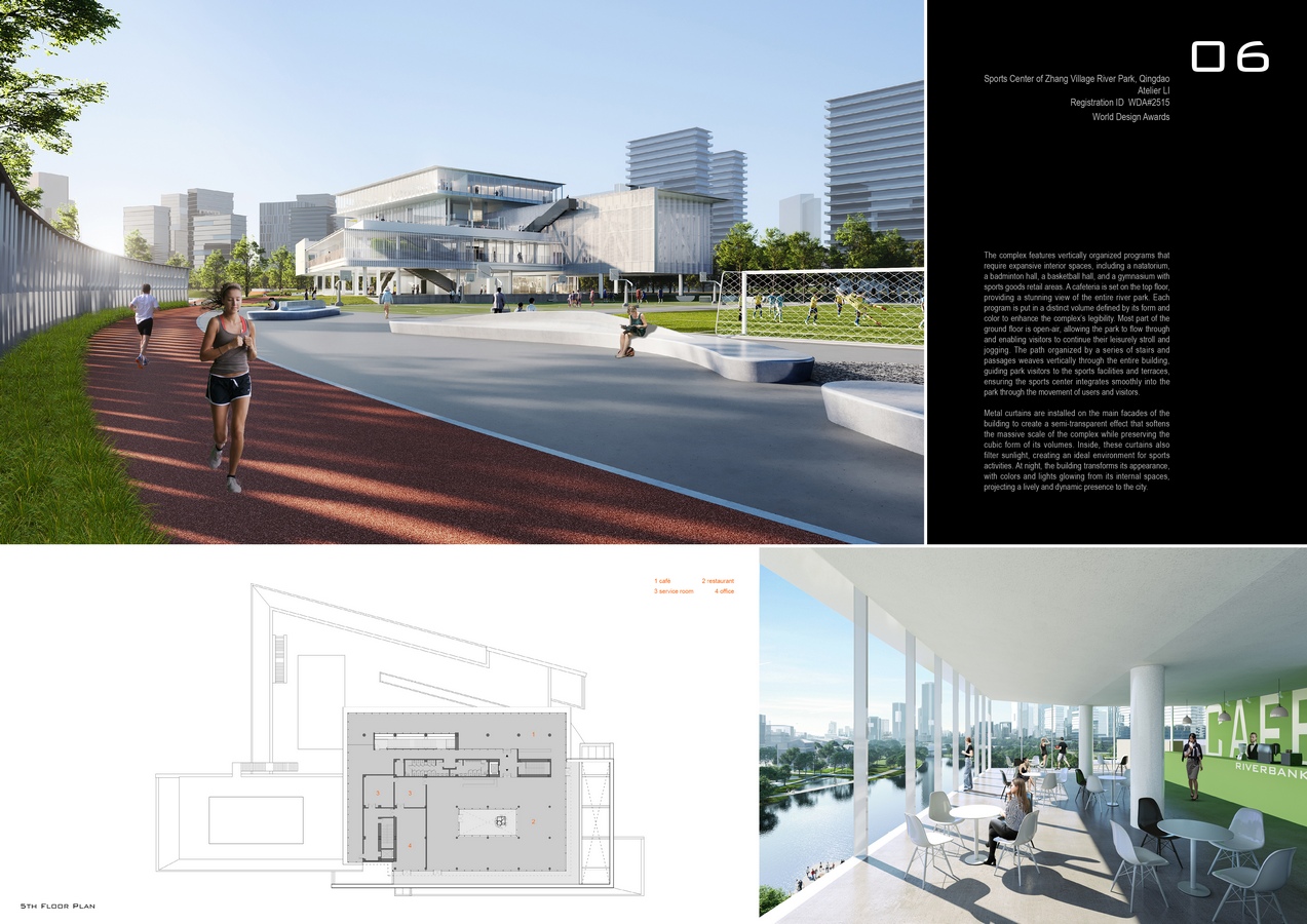 Atelier LI: Winner of World Design Awards 2025. Located on the south bank of the Zhang Village River in the city of Qingdao, the sports center is a complex offering a variety of exercise programs. The design emphasizes the transitional role of the sports center, bridging the scale of the park with the urban scale defined by city routes and buildings. Higher volumes are positioned along the urban route, showcasing a 100-meter-long facade, while lower volumes are placed near the riverbank, giving the enormous structure an approachable gesture for park visitors. People can enjoy a relaxing atmosphere around the sports center and engage in activities along the riverside walking path.