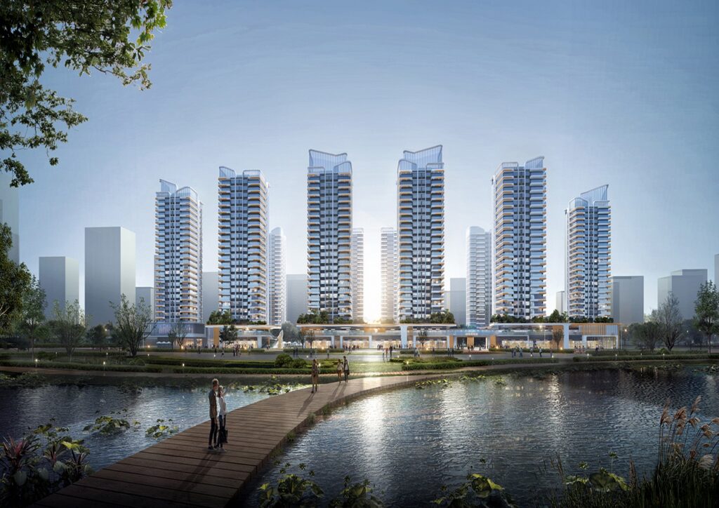 The master plan elegantly embraces in harmony with nature, encapsulating Longhu Park, lakeside scenery, and diverse public spaces. It capitalizes on the waterfront vantage point, infuses the Longhu water allure into the upscale residential area, thereby crafting a vibrant city hub of Longjiang. The architectural approach utilizes the abstract stacked-mountains design motif to coordinate the urban landscape and intertwine layers to construct a holistic space harmoniously. The sweeping and lightweight aesthetics of white cloud is mimicked, creating an open skyline.