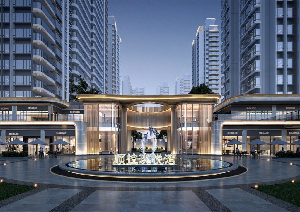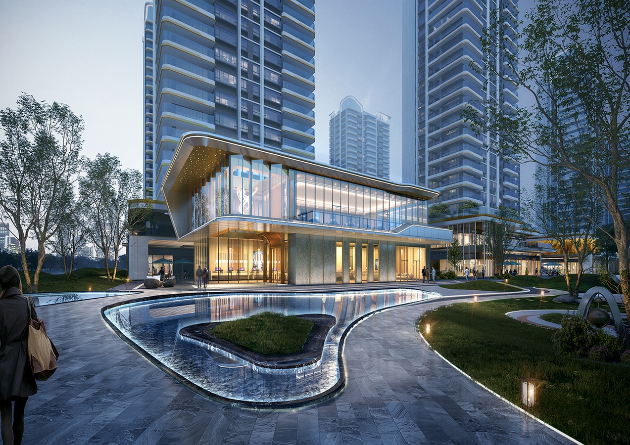 The planning and design elegantly draws upon water, the cherished advantage, and weaves the enchantment of Longhu Lake into its premium housing. The overall planning deftly adopts an enclosed layout. 12 high-rising residences are symmetrically arranged. The southern and eastern edges form a picturesque, 270-degree open and unrestricted vista to make maximum use of the landscape resources. A public facade design is respectfully introduced along the street, with the scattered buildings beautifully distributed to form an iconic urban interface. The 250-meter extensive garden in the east-west direction is utilized to the fullest extent. The main entrance space, the sunken club, and the multi-level garden landscape nodes are lined seamlessly together to instill a potent sense of ritual within the planning axis. Two spacious 30-meter-wide line-of-sight corridors are set up in the north-south direction, echoing the junction of the urban park on the southeast side and the picturesque Longhu lakeside landscape belt. The interior and exterior landscapes are creatively combined to divert water into the park.