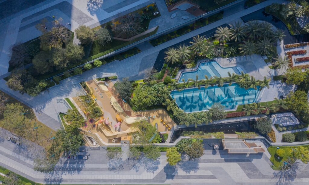 In the 13,000-square-meter large garden located in the center of the site, the design team arranges forest runway, activity pavilion, waterfall curtain, waterside platform, etc., and the leisure pool and landscape waterfall in the sunken courtyard are regarded as a continuation of the Pearl River system. The two courtyards with different elevates create diversified social scenes with multi-level landscape, and the leisure function is integrated into the landscape, so that people can get close to nature in daily life. At the same time, the enhanced visual effect of the community space and the diversity of use make the community a secret forest in the city.