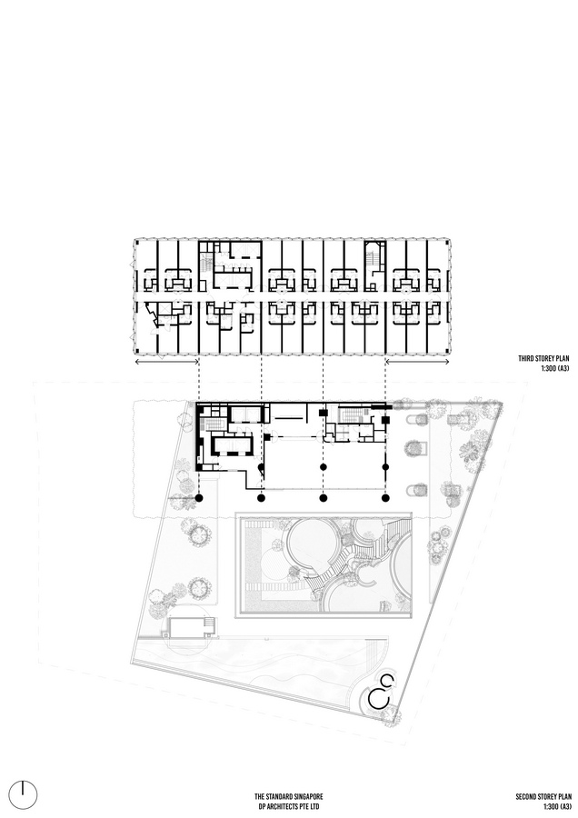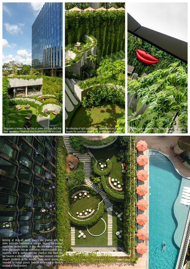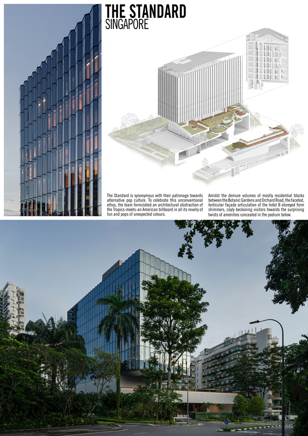 DP Architects: Winner of World Design Awards 2025. Located along Orange Grove Road, The Standard, Singapore is nestled among Singapore’s most prestigious addresses[ST1] , a stone’s throw from the 150-year-old UNESCO-honoured Botanic Gardens and Nassim and close to the hustle and bustle of Orchard Road – akin to Singapore’s New York’s Fifth Avenue. Amidst the demure volumes of mostly residential blocks between Nassim and Orchard Road, the lenticular façade articulation of the hotel’s eight-storey form shimmers, coyly beckoning visitors towards the surprising twists of amenities concealed within the hotel podium below.