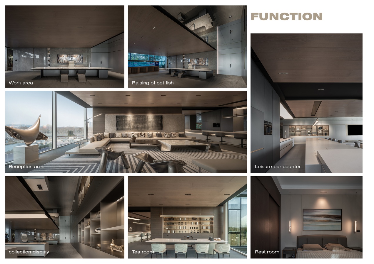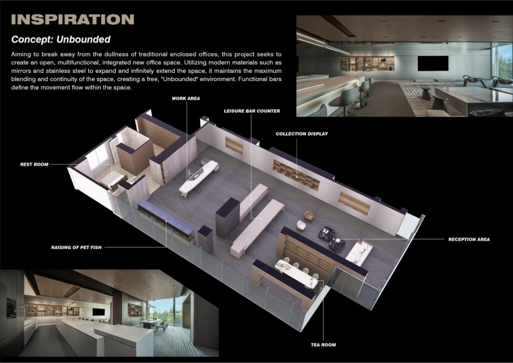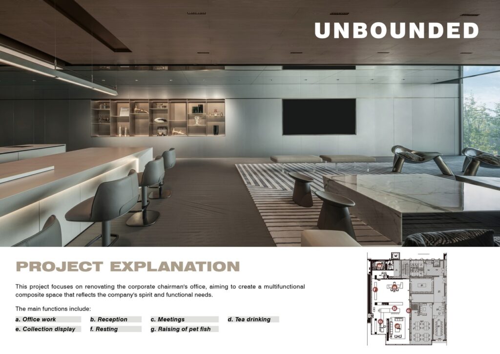 Aiming to break away from the dullness of traditional enclosed offices, this project seeks to create an open, multifunctional, integrated new office space. Utilizing modern materials such as mirrors and stainless steel to expand and infinitely extend the space, it maintains the maximum blending and continuity of the space, creating a free, “Unbounded” environment. Functional bars define the movement flow within the space.