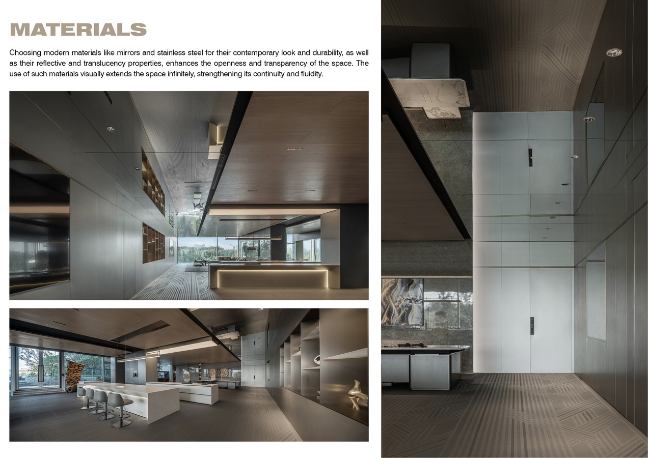 Choosing modern materials like mirrors and stainless steel for their contemporary look and durability, as well as their reflective and translucency properties, enhances the openness and transparency of the space. The use of such materials visually extends the space infinitely, strengthening its continuity and fluidity.