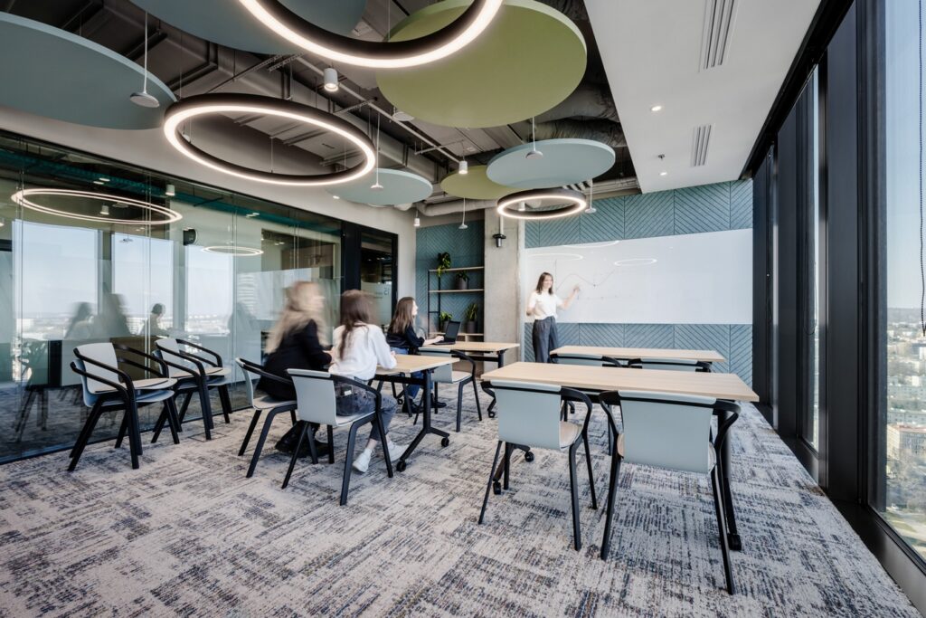 The design supports a variety of work styles and needs. Quiet zones, acoustic booths, and focus rooms provide spaces for concentration, while workshop areas, meeting rooms, and a library encourage collaboration and knowledge sharing. Each area was created with a specific purpose in mind so employees can easily find the right spot for the task.