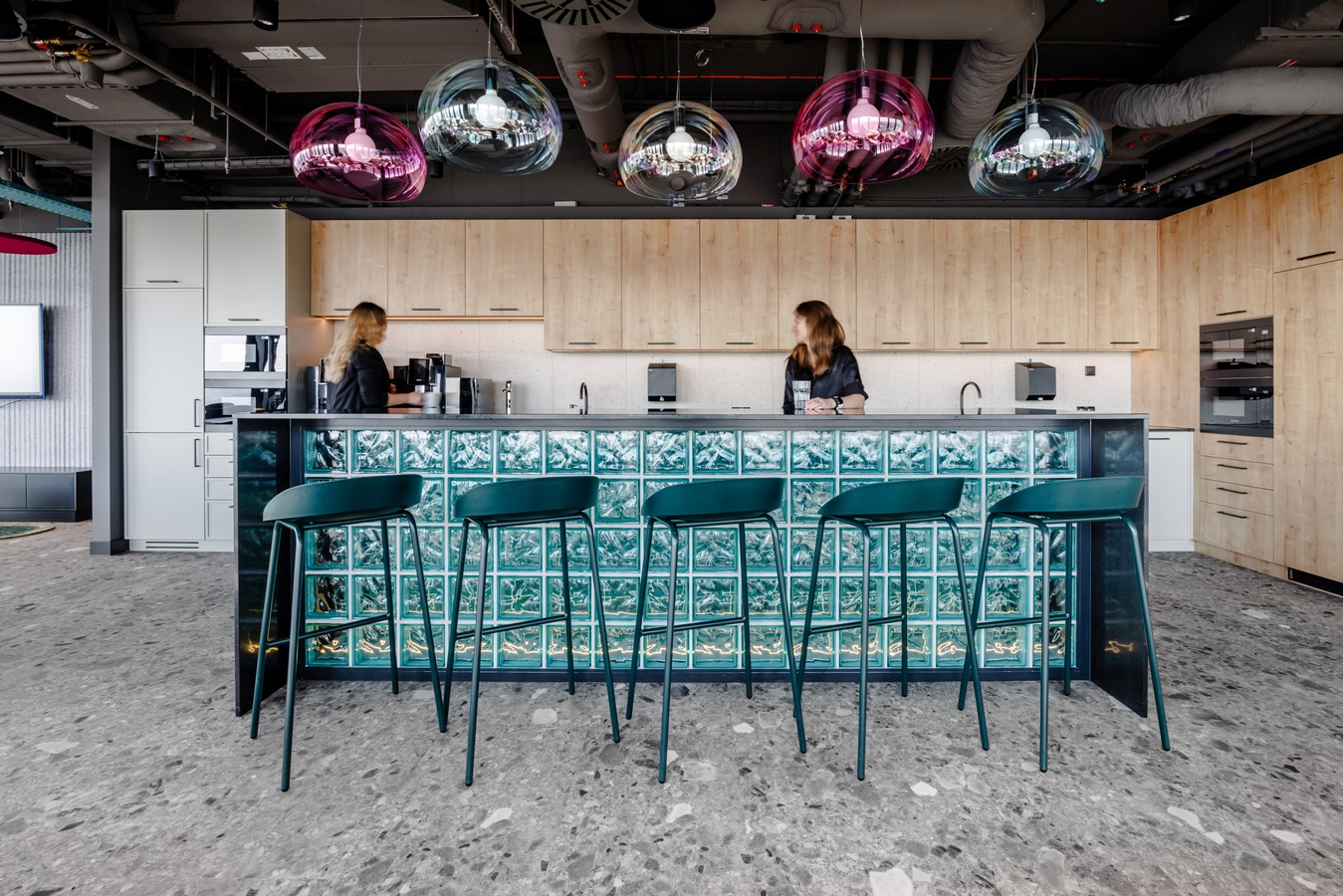 At the core of the office lies the kitchen and social zone, a vibrant space designed to stimulate creativity and foster connection. With panoramic views of the Katowice skyline, this area becomes a symbolic bridge between the workplace and the city. A specially designed bench by the windows, which looks as if it is floating in the air, provides a peaceful place to sit and admire the panoramic view of the city, and serves as a unique connection to Katowice’s scale and character.