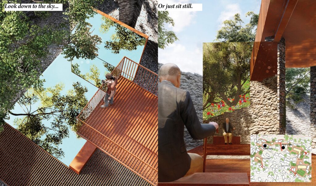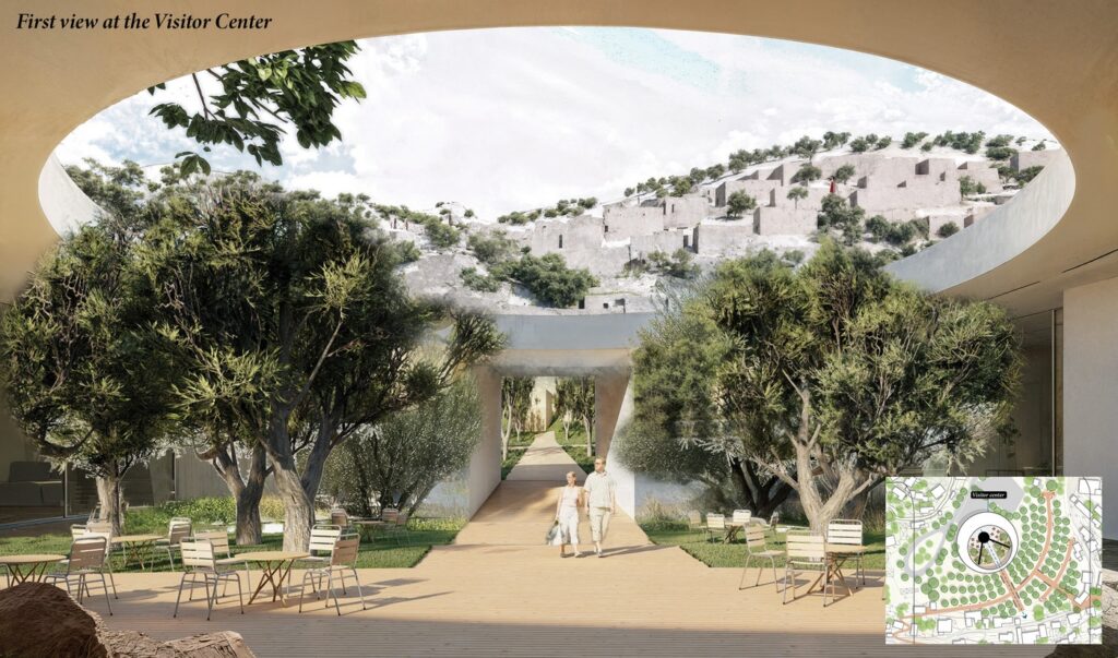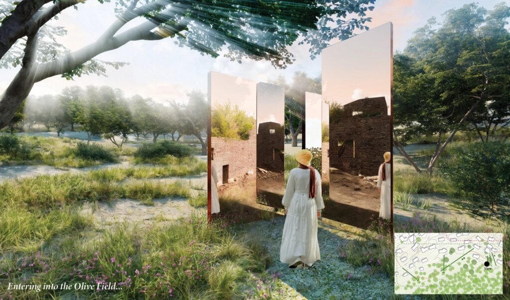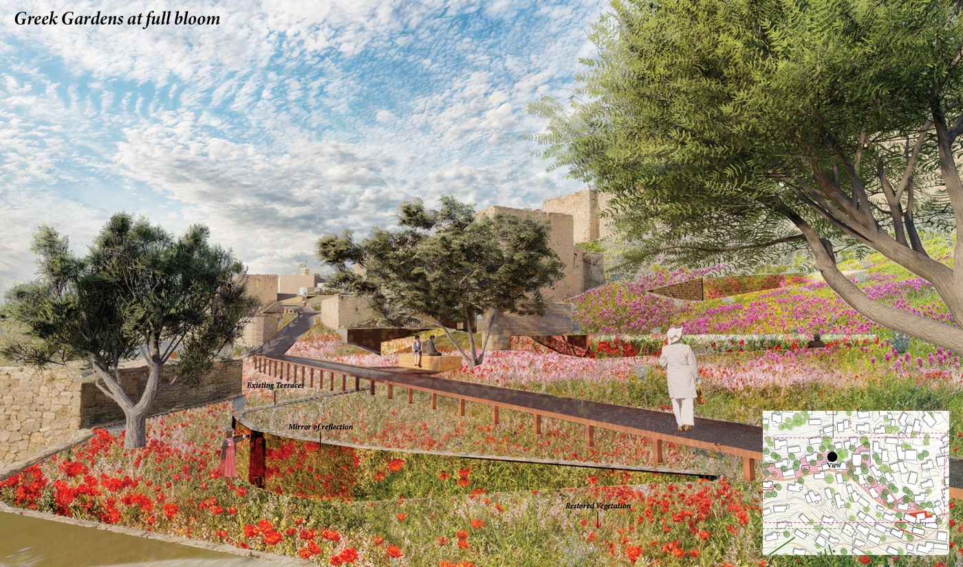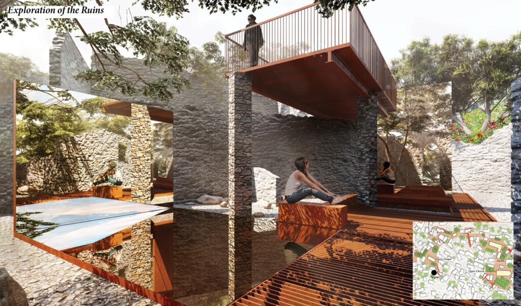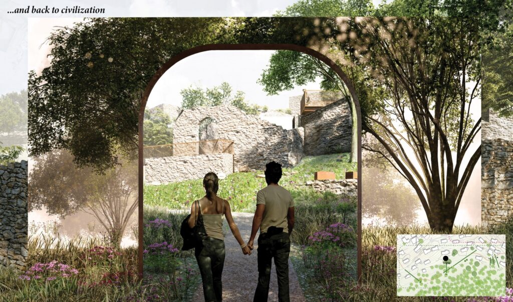 In my reinterpretation of this concept, the “open-air museum” is not a fixed route or checklist of attractions. Instead, Three landscapes areas —ruins, gardens, and fields—compose an experiential journey. Visitors begin among the Greek dwellings, wander through the domestic gardens, cross olive forest fields, and ascend to the hilltop tower where the community once gathered for celebrations. Without a prescribed path, they are free to drift, linger, and immerse themselves in the warmth of sunlight.