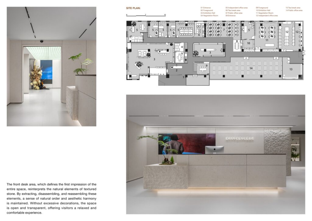 The front desk area, which defines the first impression of the entire space, reinterprets the natural elements of textured stone. By extracting, disassembling, and reassembling these elements, a sense of natural order and aesthetic harmony is maintained. Without excessive decorations, the space is open and transparent, offering visitors a relaxed and comfortable experience.