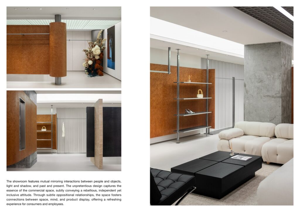 The showroom features mutual mirroring interactions between people and objects, light and shadow, and past and present. The unpretentious design captures the essence of the commercial space, subtly conveying a rebellious, independent yet inclusive attitude. Through subtle oppositional relationships, the space fosters connections between space, mind, and product display, offering a refreshing experience for consumers and employees.